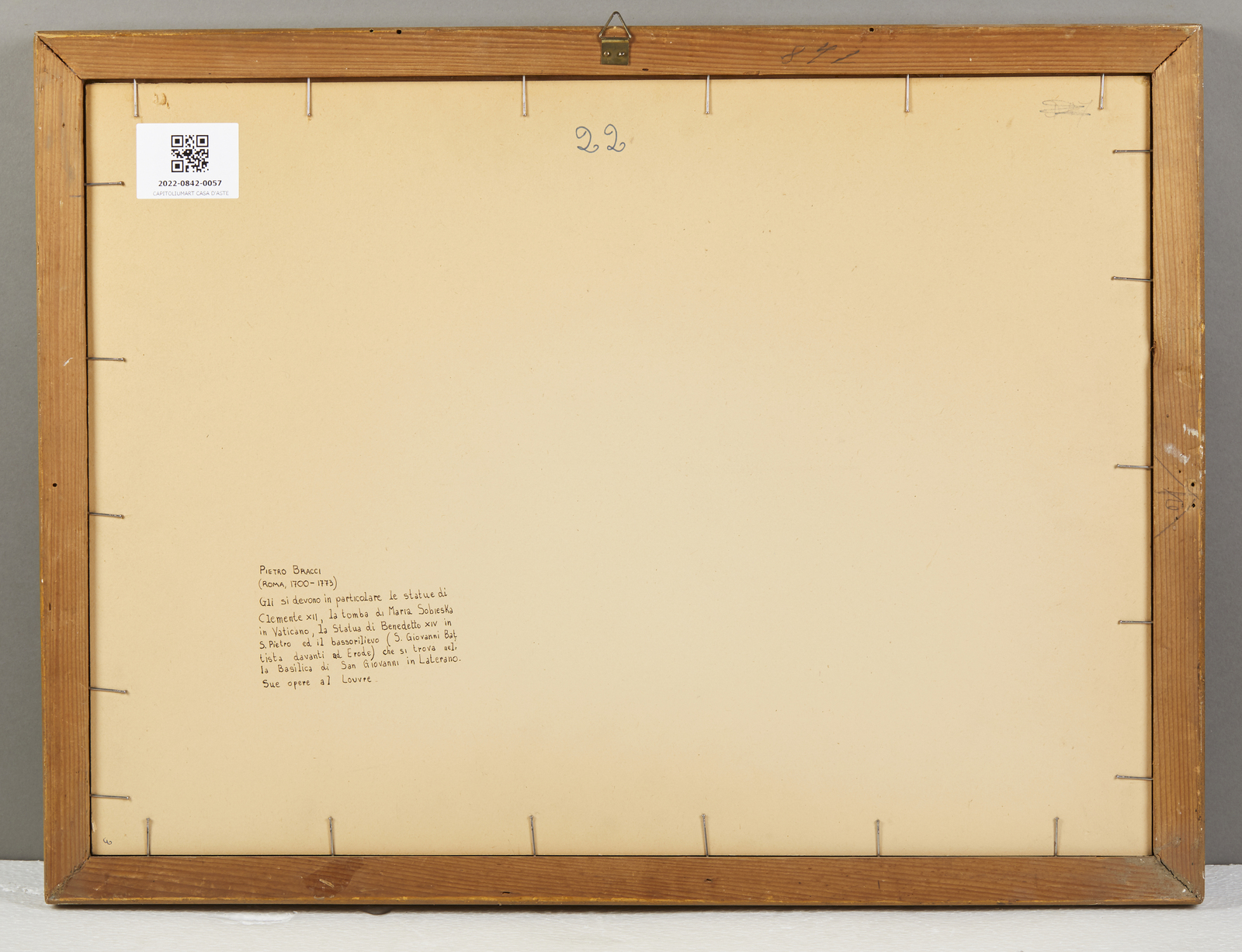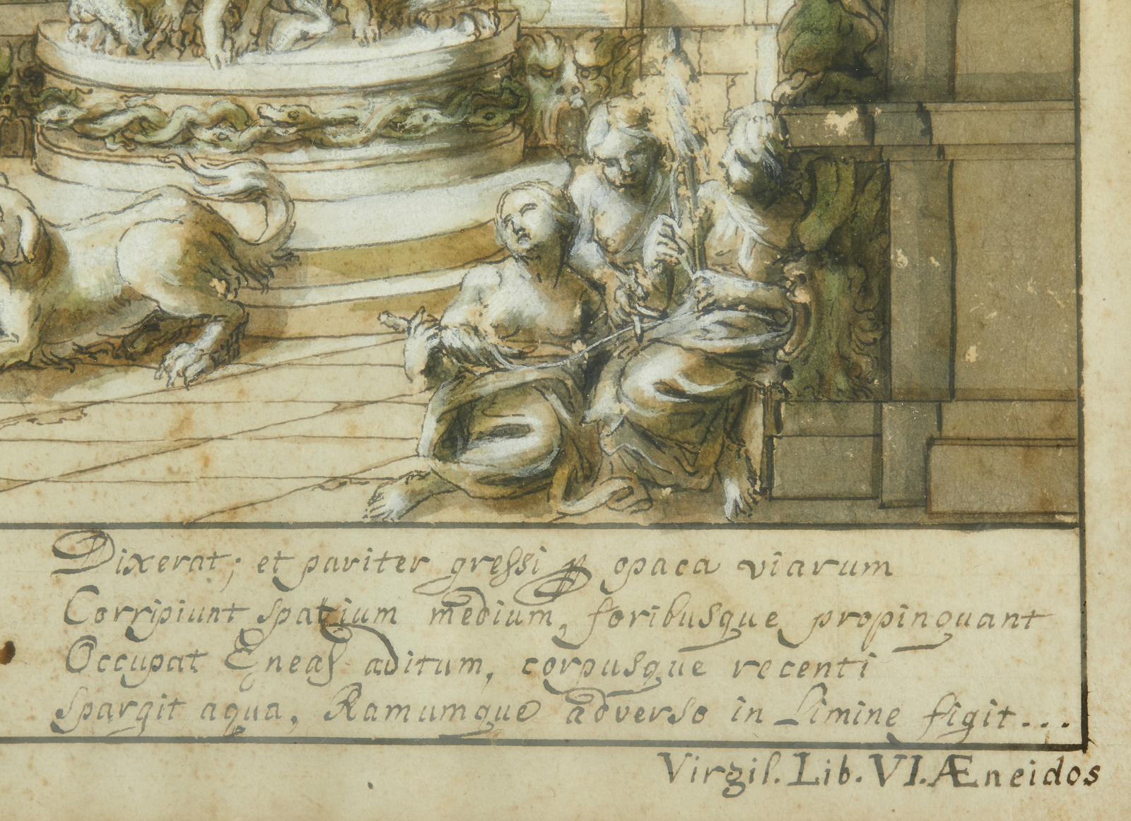 Difetti. Firmato in basso a sinistra ''Pet. Bracci Inv. et Delin.''Provenienza: Collezione privata, Parma.Bibliografia: P. Consigli Valente (a cura di), ''Disegni Antichi (Collana Le collezioni private parmensi)'', 1988, p. 285, n. 355.Pietro Bracci fu uno dei principali scultori dell'ultimo Barocco romano, prima allievo di Camillo Rusconi e poi artista al servizio dei massimi esponenti della Curia: protetto del cardinale Alessandro Albani, membro (e poi principe) dell'Accademia di San Luca e dell'Accademia Clementina di Bologna, tra le sue opere si annoverano molti ritratti in marmo dei membri della corte pontificia, due statue di papa Clemente XII (una a Ravenna, l'altra originariamente collocata in Campidoglio, poi distrutta nel 1798) e, soprattutto, il celebre gruppo statuario al centro della Fontana di Trevi, con l'imponente Dio Oceano sul suo cocchio in forma di conchiglia trainato da due cavalli marini e due tritoni. Proprio all'impianto e all'idea decorativa di questo capolavoro tardobarocco sembra rimandare il nostro disegno, che raffigura il momento in cui Enea, seguendo le indicazioni della Sibilla, affigge il ramo d'oro alle porte di Dite prima di dirigersi verso i Campi Elisi: l'intero episodio è peṛ ambientato in un'architettura barocca di fantasia, quasi un ''hortus conclusus'' di marmi dove gli esseri infernali, Cerbero e gli stessi Plutone e Proserpina sono raffigurati come vere e proprie sculture di marmo. Gli stessi sovrani dell'Ade, inseriti in un'architettura con cariatidi e teste di Gorgone, sembrano parte di una decorazione di una fontana, come quelle delle ''ville di delizie'' rinascimentali e poi barocche, o come, appunto, il gruppo del Dio Oceano della Fontana di Trevi.