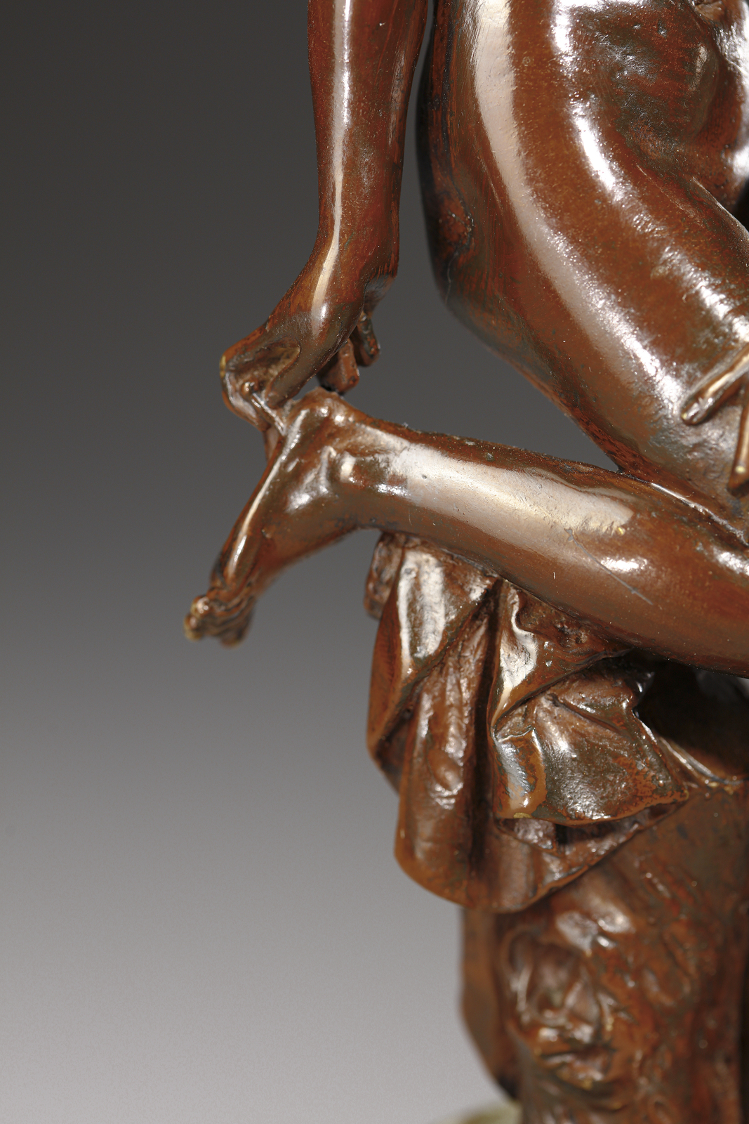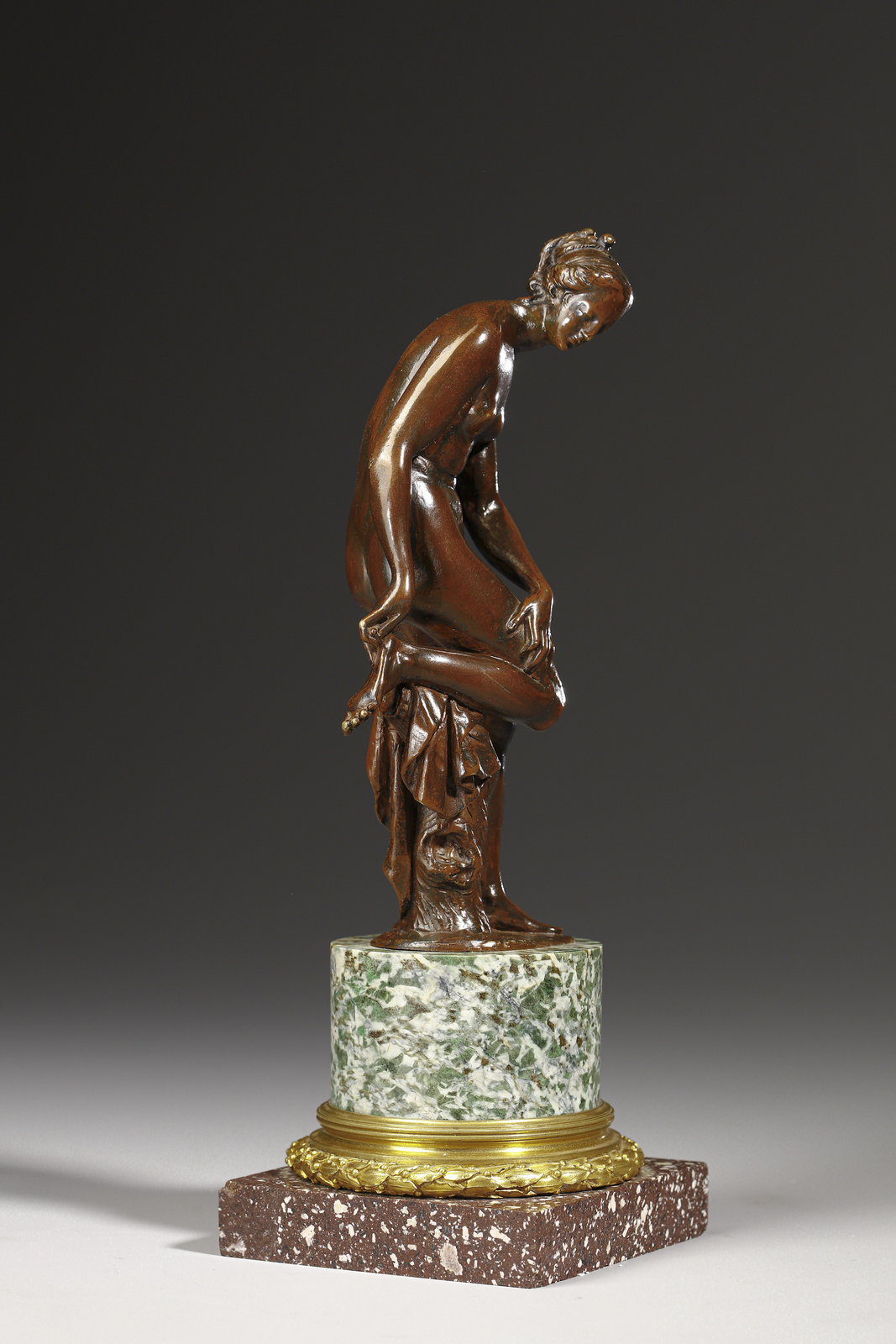 L'opera è accompagnata da attestato di libera circolazione.L'opera è accompagnata da expertise a cura del Dr. Charles Avery del settembre 2020 (di cui si riporta di seguito un estratto) ed esame della lega metallica. Marchio sulla cima troncata del ceppo d'albero ''BM'' (Boissel de Monville).'Misure della base in marmo: 8,5x10x10 cm.Provenienza: Barone Hippolyte Boissel de Monville (1794-1873), collezionista e agente, soprattutto per i Rothschild. ''Catalogue de la Précieuse Collection de Bronzes Italiens des XVe et XVI siècles, composant la Collection de M B. de M[onville]'', Drouot, Parigi 24-25 gennaio 1861, lotto 11, venduto per 750 franchi.Bibliografia di riferimento: W. Bode, ''Collection of J. Pierpont Morgan: Bronzes of the Renaissance and subsequent periods'', Parigi 1910, pp. XXXIV-V.G. Brière e M.-M. Lamy, ''L'inventaire de Barthélémy Prieur, sculpteur du roi'', in Bulletin historique et littéraire de la Société du Protestantisme francais, XCVI, (Parigi 1949, pp.41-68). C. Grodecki, ''Documents du Minutier Centrai des Notaires de Paris: histoire de l'art aux XVIe siècle'' (Cl 540- 1600), II, Parigi 1986, pp. 129-33. M. Buckling, ''Die Negervenus'', Liebieghaus, Fratùcfurt-am-Main, 1991. A. Lefebure, ''L'atelier de Barthélemy Prieur et l'imagerie royale sous le règne d'Henri IV'', and R. Seelig-Teeuwen, ''Barthélemy Prieur, portraitiste d'Henri IV et Marie de Medicis'', in Avènement d'Henri IV, quatrième centenaire, vol. 5, Les arts au temps d'Henri IV, Association Henri IV, 1989 (Pau, 1992).R. Seelig-Teeuwen, ''Barthélemy Prieur, contemporain de Germain Pilon'', in Germain Pilon et les sculpteurs francais de la Renaissance (Louvre, Conférences et colloques. La Documentation française) (Parigi 1993), pp. 365-85. A. Radcliffe, ''The Robert H. Smith Collection: Bronzes 1500-1600'', Londra 1994. R. Seelig-Teeuwen, ''Prieur'', in The Dictionary of Art, London, 1996, vol. 25, pp. 576-77. A. Radcliffe and N. Penny, ''Art of the Renaissance Bronze 1500-1650'', The Robert H. Smith Collection, Londra, 2004: R. Seelig-Teeuwen, ''Prieur'', in The Encyclopedia of Sculpture, New York/Londra 2004, pp. 1362-65. R. Seelig-Teeuwen, '''Barthélémy Prieur'', in G. Bresc-Bautier & G. Scherf [ed.], Bronzes francais de la Renaissance au Siècle des lumières, Parigi, New York, Los Angeles, 2009, pp. 102-47, pp. 136 -38. R. Seelig-Teeuwen, D. Bougarit and F. G. Bewer, '''Barthélémy Prieur fondeur, son atelier, ses methods-de travail'', French Bronze Sculpture: Materials andTechniques 161h -18th century, Londra 2014, pp.18-38.Barthélémy Prieur fu uno scultore francese specializzato nella lavorazione della pietra e del marmo che - soprattutto nella fase finale della sua carriera - si specializzò nella fusione in serie di piccole sculture in bronzo pensate direttamente per il collezionismo (precedendo di poco gli sforzi dello scultore-bronzista fiorentino Antonio Susini con le sue sculture dai modelli del Giambologna). Tra il 1564 e il 1567 lavorò alla corte del duca Emanuele Filiberto di Savoia a Torino e, mentre era in Italia, è ipotizzabile che abbia visitato Firenze, Milano e Roma. È attestato a Parigi nel 1571, dove, per una cugina della sua prima protettrice, Maddalena di Savoia, eseguì due Virtù in bronzo per il monumento al cuore del conestabile Anne de Montmorency, suo defunto marito. Un inventario redatto dopo la morte della prima moglie di Prieur nel 1583 rivela la sua ricchezza e la gamma dei modelli che stava producendo in bronzo. Essendo protestante, fuggì a Sedan, dove nel 1591 fu nominato scultore del re da Enrico IV. Ritornato a Parigi insieme al monarca nel 1594, si dedicò alla decorazione architettonica del Palais du Louvre, oltre a preparare le sculture per il monumento di Enrico IV e della regina, Maria de' Medici. Un quarto di secolo dopo, un altro inventario, redatto dopo la morte dello stesso Prieur nel 1611, rivela una gamma ancora più ampia di modelli di piccoli bronzi in corso di produzione: stampi in gesso, modelli per colate in cera e bronzi, alcuni solo in parte finiti, conservati stanti nella fonderia, ecc. Questi includevano rappresentazioni del re e della regina (la più celebre delle quali è un gruppo di re Enrico IV a cavallo che sconfigge i suoi nemici) animali e figure umane classiche o di genere. LE FIGURE NUDE DI PRIEUR: Caratteristico delle numerose statuette e busti di giovani donne di Prieur, che, come il presente esempio, sono quasi sempre ninfe o dee pagane e bambini, è il profilo del viso come si può osservare in quest'opera: una fronte alta che cade all'indietro in una linea continua quasi ''greca'' con un naso piccolo, un'attaccatura dei capelli alta, mentre piccole labbra increspate fanno la loro comparsa sopra a un mento delicatamente sfuggente. Molte delle statuette di Prieur raffigurano donne nude colte nell'atto dell'abluzione. Nel catalogare un eccellente esempio di questa tipologia, Radcliffe scrisse nel 1994 e lo ripeté (con N. Penny) nel 2004: ''Non è identificabile con nessun oggetto nell'inventario di André le Notre del 1700. Tuttavia, corrisponde all'incirca in altezza con le statuette in piedi nell'inventario dopo la morte di Barthélémy Prieur del 1611. Supporto per la sua comparazione con le statuette di Prieur di donne sedute è fornita dal suo confronto, nell'ex collezione Pourtalès, Parigi, con la statuetta di una donna che si intreccia i capelli''. Radcliffe ha concluso: '''[...] il modello attuale, che è meno sofisticato nella sua composizione, è molto raro''. Tuttavia nella sua analisi mancò un passaggio illuminante di Bode nell'Introduzione al suo catalogo della Collezione Pierpont Morgan, 1910:''C'è un artista il cui nome non ci è noto, ma che si rifà da vicino ai modi di Gian Bologna. Gli si possono attribuire otto o dieci diverse statuette di bronzo, tutte di carattere simile. Come Gian Bologna, questo artista sembra essere originario dei Paesi Bassi o del nord della Francia, con un pa