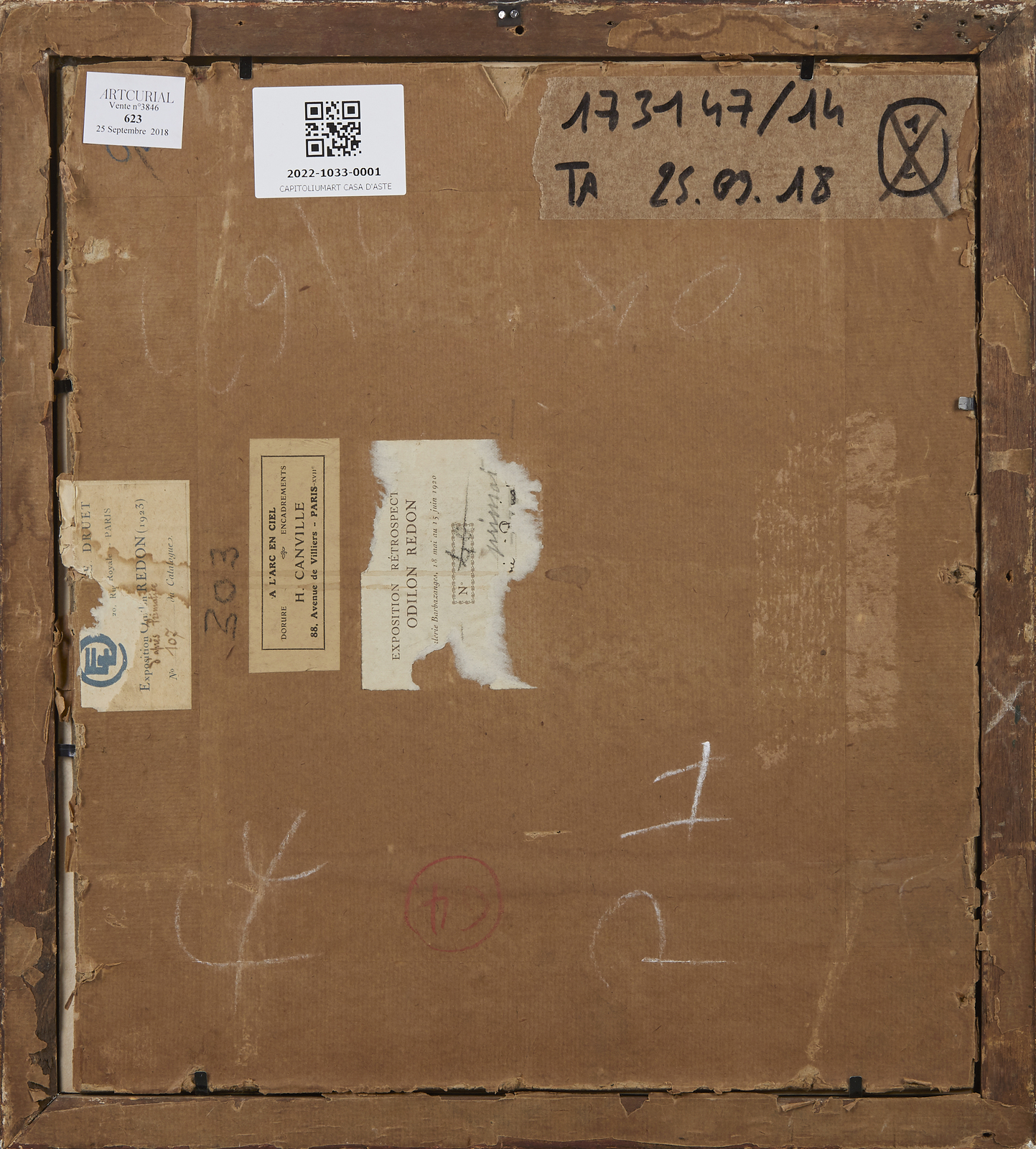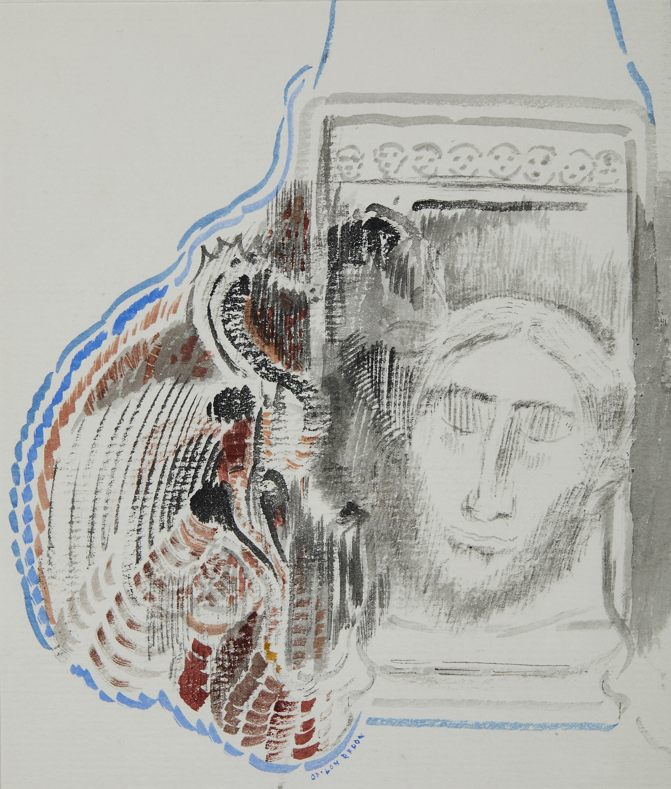 Firmato in basso al centro.Provenienza: Dono dell'artista al medico della famiglia Redon, Francia. Parigi, Hotel Drouot, Beaussant-Lefèvre, 29 giugno 2011, n°69. Collezione privata, Italia.Il tema degli occhi chiusi è centrale nella poetica artistica di Redon e, in generale, di tutto il movimento Simbolista: il vero sguardo, quello capace di comprendere la reale essenza delle cose, non è quello rivolto verso l'esterno, ma quello che scruta all'interno dell'animo, in una visione in grado di cogliere l'inesprimibile mistero dell'esistenza, eterna nel suo continuo e vario rinnovarsi, quando il suo effimero involucro fisico è invece inevitabilmente destinato a decadere. Per Odilon Redon portare lo sguardo ''all'interno'' significa così avvicinarsi davvero al proprio io, lontano dal mondo fisico e dalle sue ingannevoli rappresentazioni del reale, in un abbandono completo alle sensazioni più intense e profonde dell'animo.
