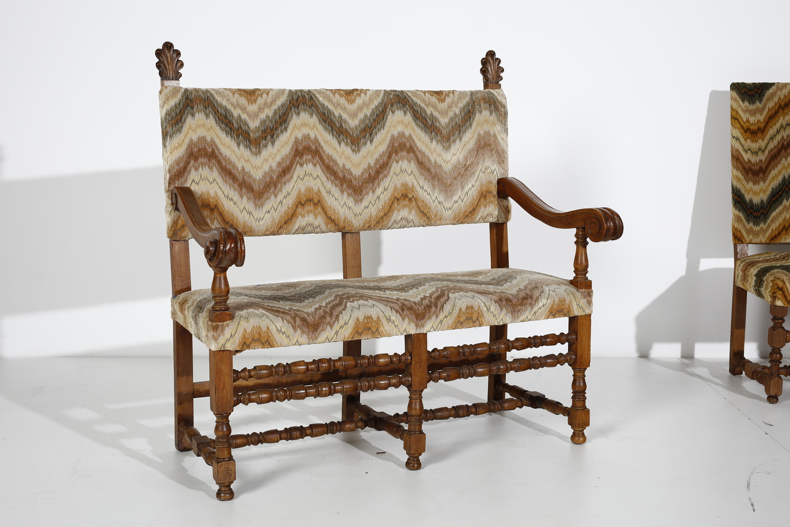 Otto sedie e un divano in noce, schienale e seduta rivestiti in tessuto fiammato, [..]
