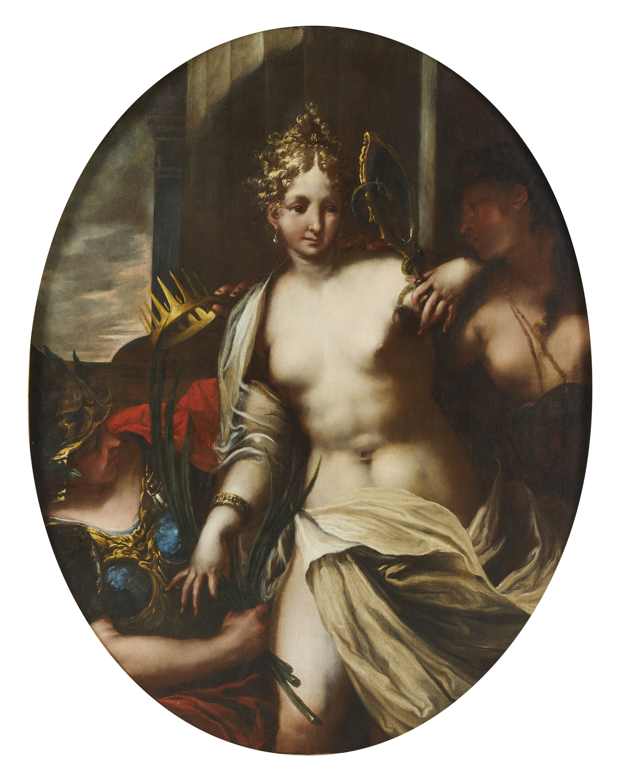 Provenienza: Collezione d'Atri, Parigi. Collezione Romano, Firenze.Bibliografia: Giuseppe Sava, Ritrovamenti e novità per Federico Cervelli e Angelo Trevisani, in Arte Veneta 77/2020, Electa Editore, 2021, pp. 166-169.Egidio Martini, La pittura del settecento veneto, Istituto per l'Enciclopedia del Friuli Venezia Giulia, 1981, fig. 397, p. 473.Referenze: Fototeca Zeri, inv. 117436, busta 558, scheda, 57601.L'ovale, di generosi dimensioni, raffigura un terna allegorico che rivela implicazioni semantiche tanto sottili quanto dense di sfumature. Al centro domina la formosa figura della Prudenza, vero asse portante del brano, contrassegnata dal serpente e dallo specchio, attributi canonici di questa virtù. Essa è in posizione preminente ed è accompagnata da una coppia di donne che le si stringono intorno, a voler rimarcare l'unità.A sinistra è una figura muliebre in abiti militari. indossa lorica ed elmo di lucente metallo, dalle spalle scende un mantello cremisi. Nella destra stringe un fascio di palme, mentre la sinistra tiene ben alta e visibile una corona aurea. In questa immagine va individuata l'allegoria della Vittoria, precisamente in quella declinazione che l'iconologia di Cesare Ripa descrive come la Vittoria della medaglia di Ottavio.La nostra Vittoria non è alata ma porta gli stigmi essenziali dell'allegoria: la corona e la palma, entrambi eloquentissime immagini di colui che impalma la vittoria, sia essa politica o militare. L'immagine tratteggiata da Ripa di dice di più, ovvero che la vittoria è intimamente legata alla prudenza, tanto da portarne il peculiare contrassegno: il serpente. Il passo è estremamente interessante e adombra un nesso con la prudenza che nel dipinto si fa esplicito allorchè si osservi che quest'ultima tocca, anzi afferra con la mano sinistra una delle palme recate dalla compagna. Si fa dunque strada -e con molta chiarezza- l'idea secondo la quale il ricorso alla prudenza è necessariamente connesso al conseguimento della vittoria: l'obiettivo dello stratega, diremmo, seguendo l'evidente accezione militare della Vittoria qui raffigurata.Ci troviamo di fronte a una di quelle espressioni composite del linguaggio allegorico, così care al Seicento, tanto nella poesia quanto nelle arti figurative. Ne consegue che la terza virtù vada interpretata in questa specifica dimensione, tanto più che è raffigurata nell'atto di abbracciare l'allegoria posta al centro.Essa, quasi del tutto ignuda, ci appare meno perspicua, priva come pare di attributi distintivi. Un seno è scoperto, l'altro occultato da quello che in apparenza potrebbe sembrare un lembo della veste e che invece è il piatto di una bilancia, con le sue catene dorate che attraversano il petto della donna, dietro la spalla della quale occorre immaginare l'altro piatto. Si tratta della Giustizia. Diventa chiarissimo il senso più riposto del trio: l'esercizio congiunto della prudenza e della giustizia conduce alla vittoria. Un enunciato che, al di là del retroterra retorico e accademico dell'iperbole allegorica, ha tutte le credenziali per convergere su un committente non solo colto e raffinato, ma con ogni probabilità socialmente posizionato nell'ambito militare: un contesto che forse non a caso richiama la principale committenza di questi anni, quella della famiglia padovana Conti e che, in ogni caso, sembra attribuire concretezza al messaggio allegorico. Fu Egidio Martini a pubblicare per primo questo dipinto nel 1982, come allegoria della Vanità, allorchè si trovava a Firenze, in collezione Romano. La scheda della fototeca Zeri rende conto della precedente ubicazione, la collezione d'Atri a Parigi. L'attribuzione a Pietro Liberi, formulata da Eduard Safarik, viene superata dal colletto riferimento espresso da Martini in favore di Federico Cervelli: un'indicazione attributiva nitida e unanimemente accettata dalla critica successiva che pure si è pronunciata sulla base della sola foto documentaria.La Prudenza tra Vittoria e Giustizia rimarca invece una luce livida, metallica, uno spirito pungente, molto personale e direi quasi neomanierista, una predilezione verso i toni bronzati e una sensualità fredda che sembrano persino meditare sulla pittura sofisticata dello Spranger. È questa la forza del pittore di origine milanese, la misura della sua personalità e ciò che lo contraddistingue nell'ambito di una corrente come quella tracciata da Liberi, che accomuna e spesso confonde esponenti di minor caratura.