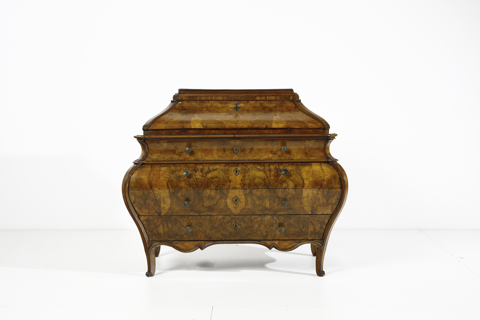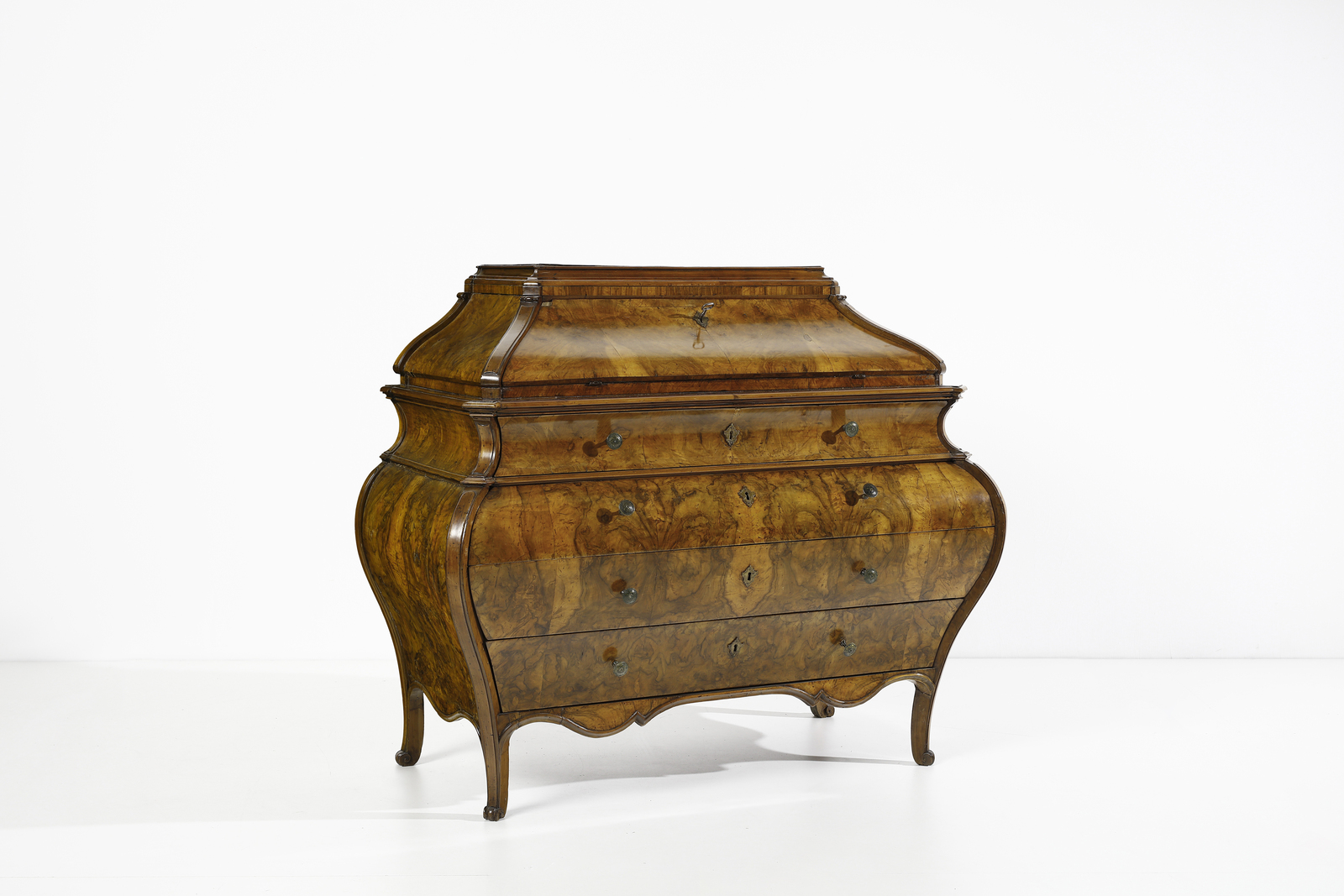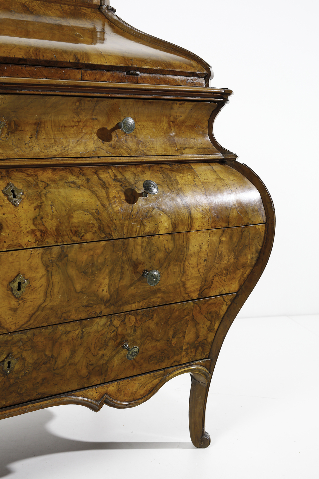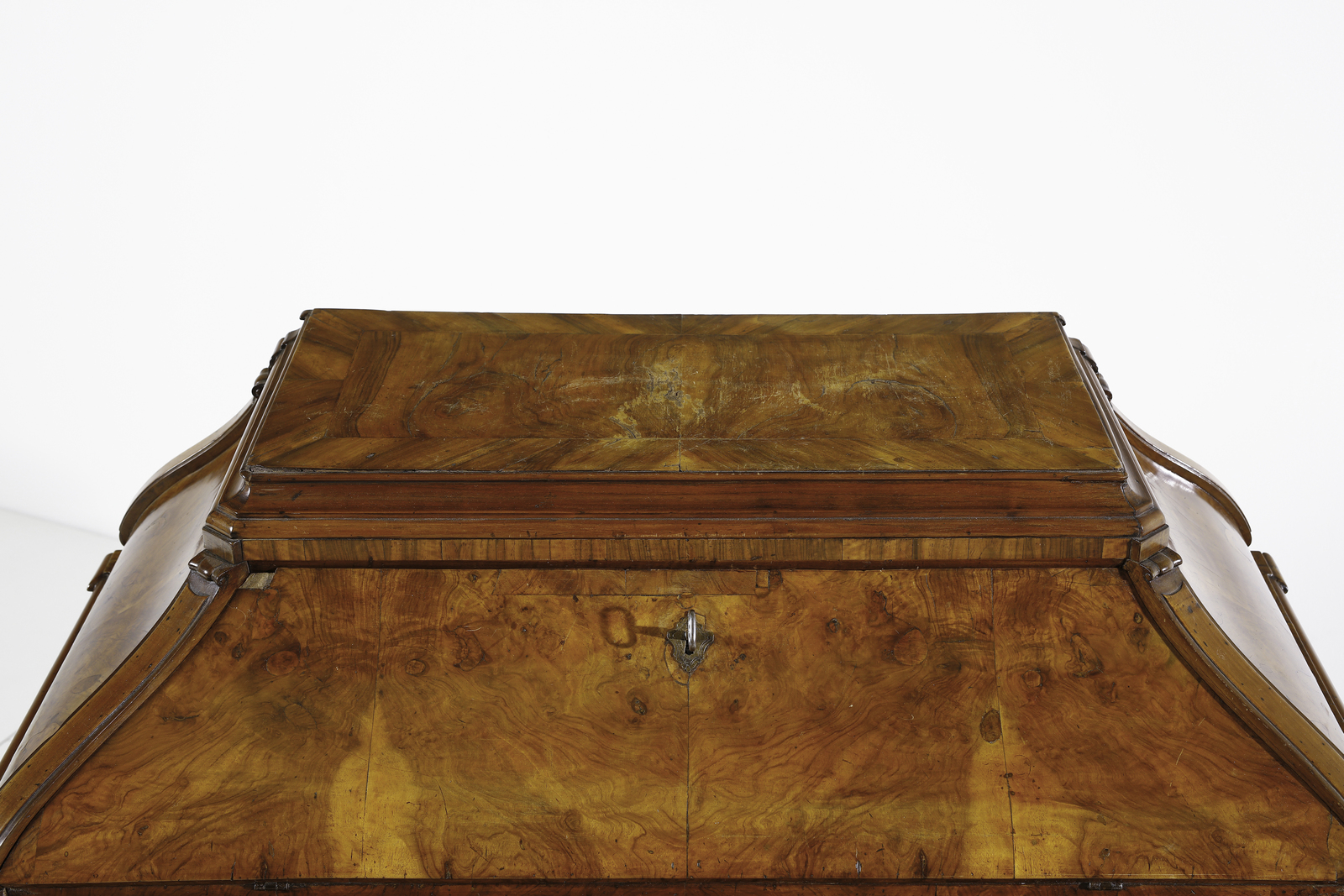 Ribalta ad urna lastronata in noce e radica di noce, fronte e fianchi mossi, cassetto [..]