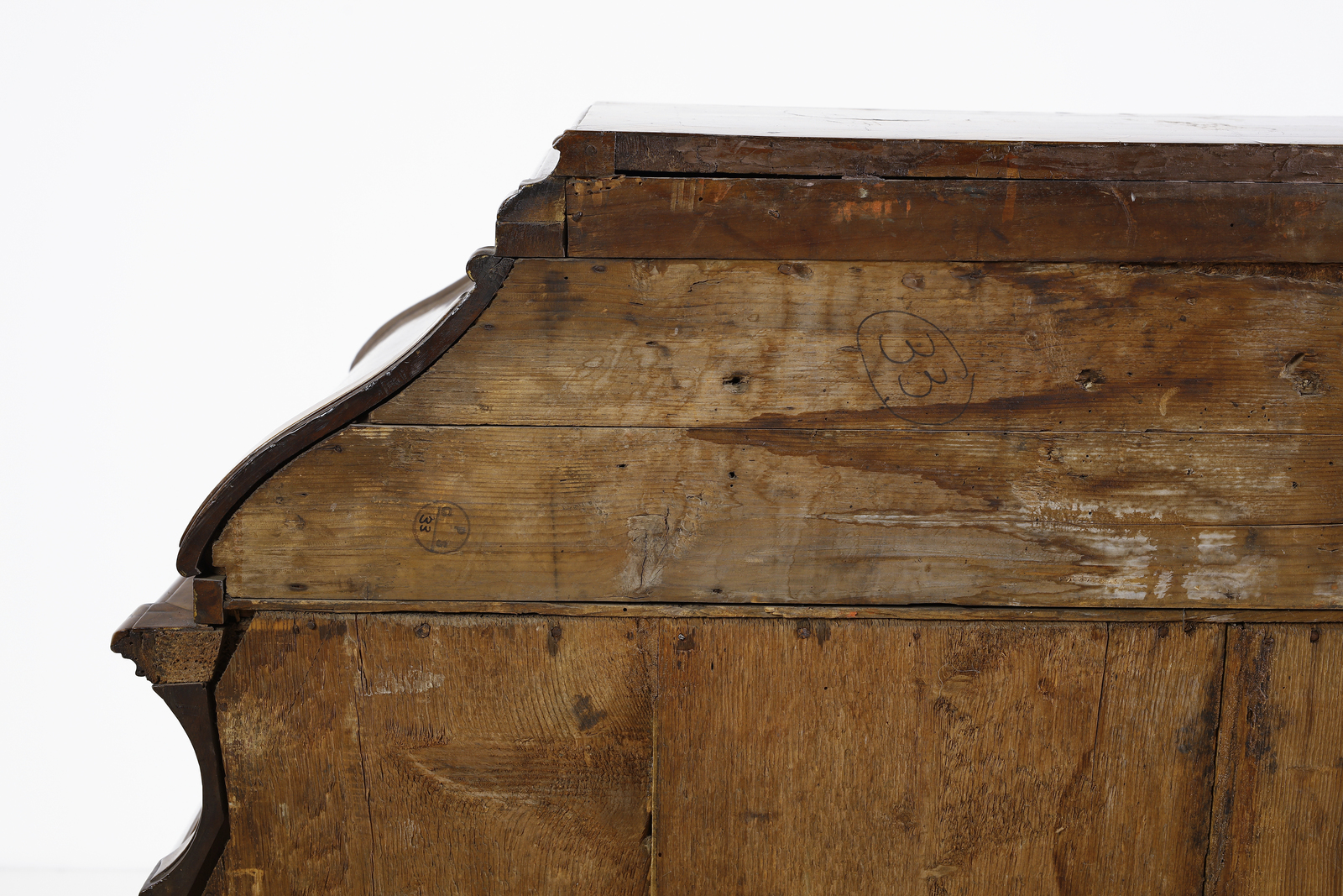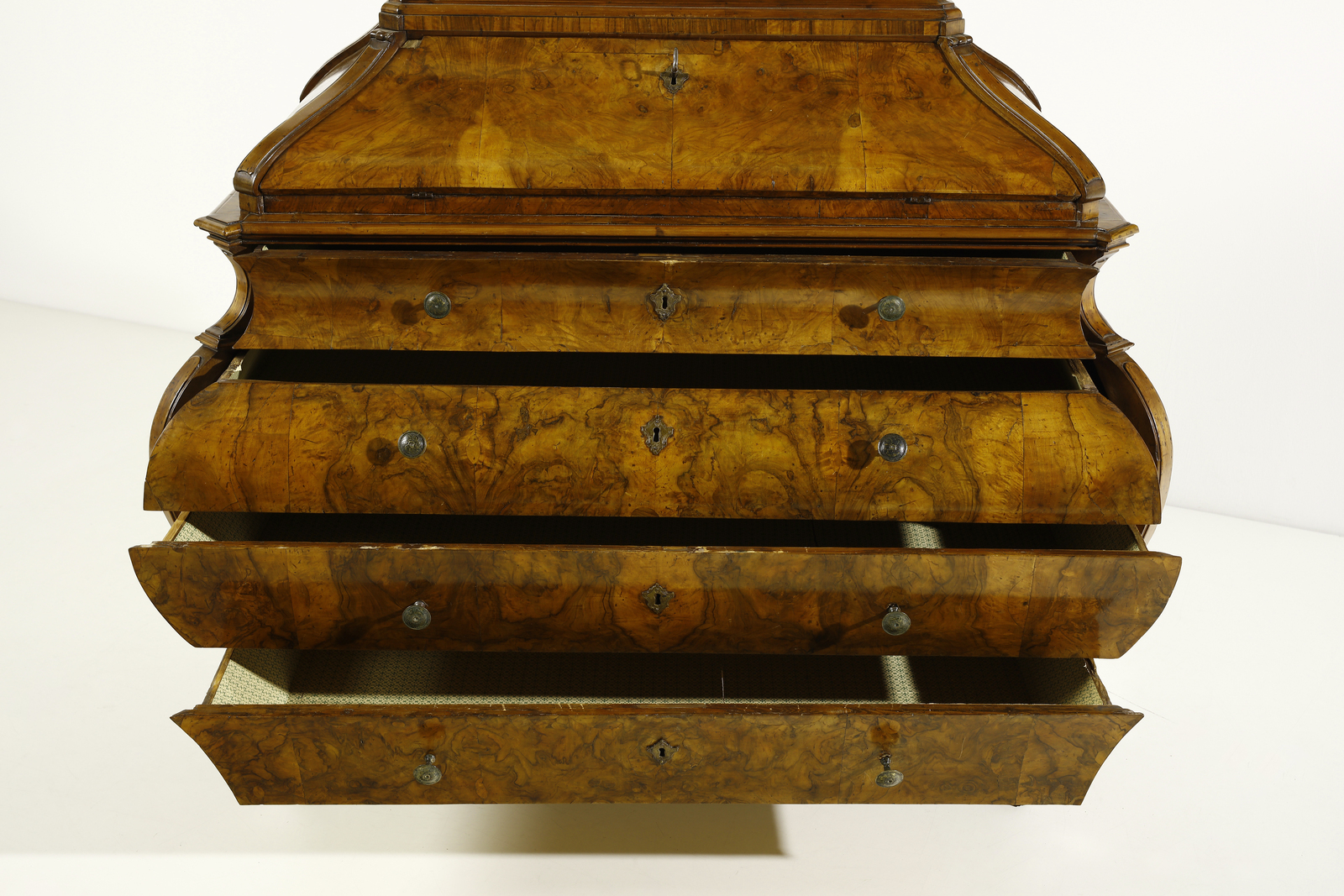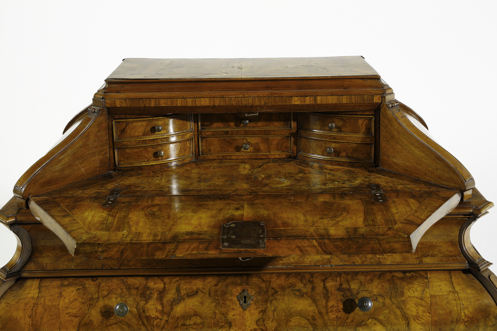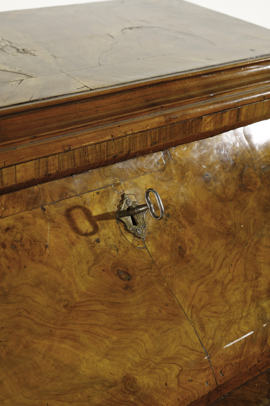Ribalta ad urna lastronata in noce e radica di noce, fronte e fianchi mossi, cassetto [..]