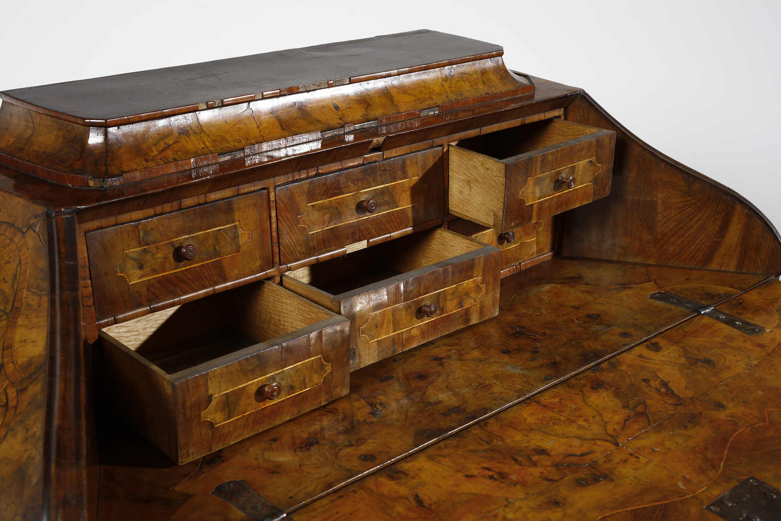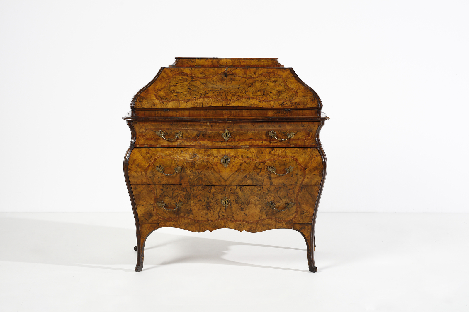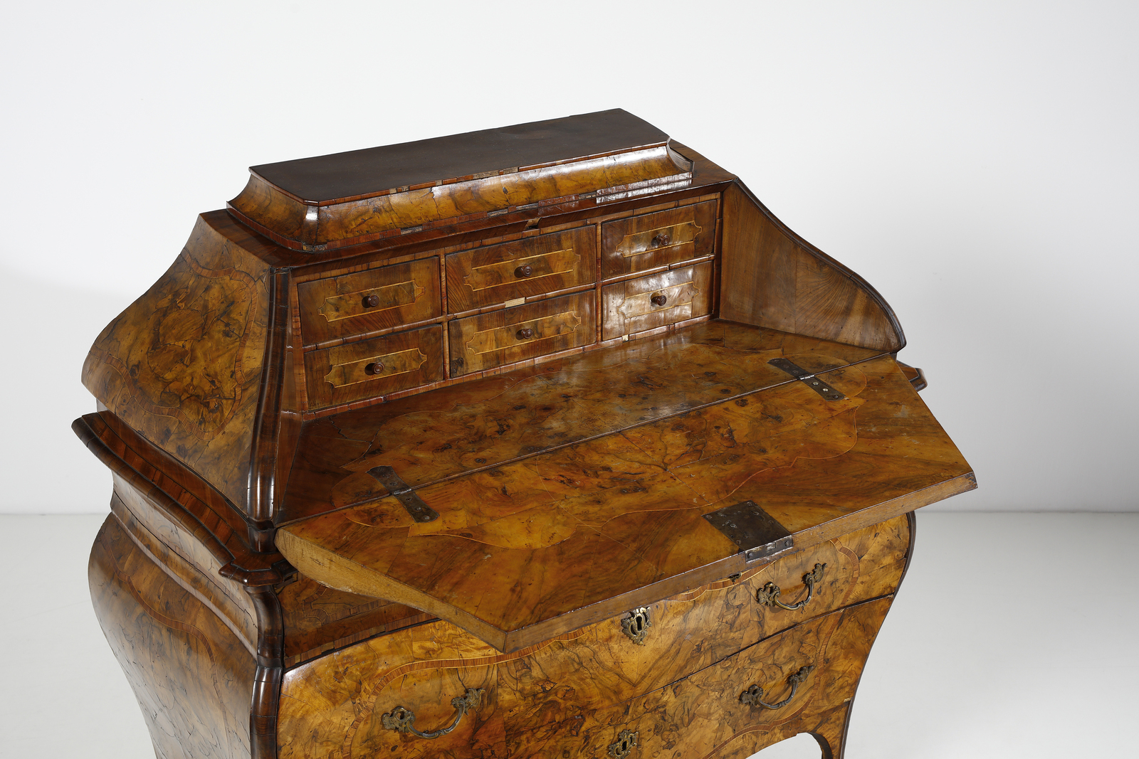 Bibliografia di riferimento: C. Alberici, ''Il mobile lombardo'', Milano 1966, p. 101. A. Disertori e A. M. Necchi Disertori, ''Il mobile del Settecento - Italia'', Novara 1985, pp. 64-65.Questa ribalta è un tipico esemplare di ebanisteria lombarda della metà del XVIII secolo, caratteristico della tipologia detta ''a sarcofago'' o ''a urna'' per la parte superiore che rimanda, nel suo raccordo in una piccola alzata, alla forma delle antiche arche funerarie. Distintive della manifattura lombarda della metà del secolo sono anche le raffinate impiallacciature della superficie, con sottili e delicate transizioni dal noce alla radica, definita da eleganti e sobrie modanature dei profili, in alcuni casi ebanizzate.