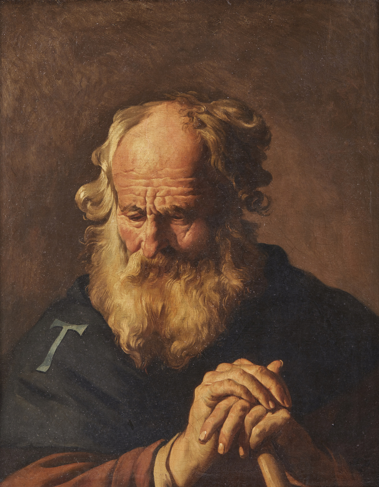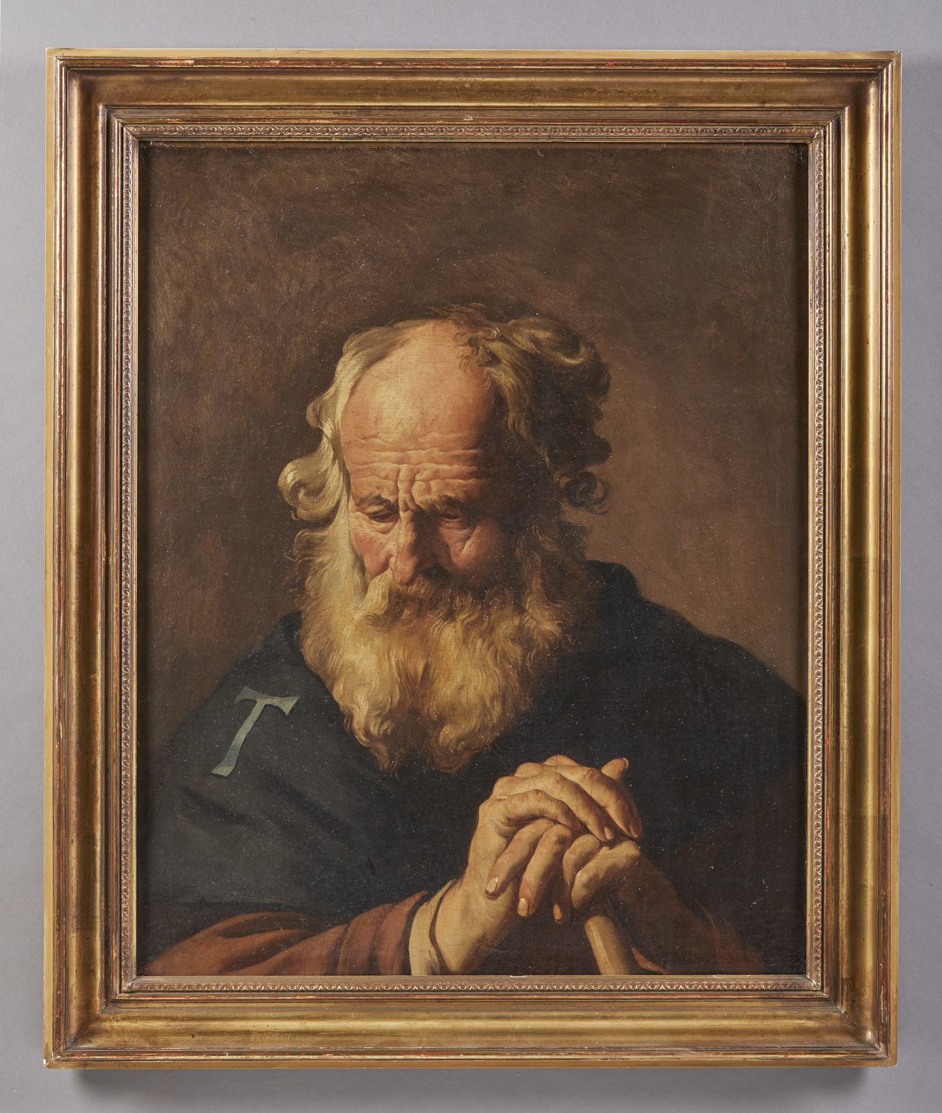 L'opera è accompagnata dall'expertise a cura di Mauro Lucco, Bazzano 15 settembre 2012.Si ringrazia il Prof. Gianni Papi per aver confermato l'autenticità dell'opera dopo visione dal vivo.L'opera è accompagnata da attestato di libera circolazione.La Vita di Antonio, scritta attorno al 365 dopo Cristo da Sant'Atanasio, descrive il santo in più luoghi come un uomo che, pur non alieno alla vita attiva, aveva dei momenti di intensa meditazione. inoltre, senza accennare al fatto che egli avesse o no la barba, afferma (capitolo 45) che riteneva dover ''dedicare ogni cura all'anima piuttosto che al corpo al quale, invece, bisogna riservare il tempo strettamente necessario'' (e possiamo dunque immaginare che la rasatura non rientrasse nel dominio dello strettamente necessario). e che (capitolo 47), ''il suo vestito interno era di sacco, quello esterno di pelle''. Quegli indumenti passarono poi in eredità, alla sua morte (capitolo 91), ai discepoli Atanasio (il suo biografo) e Serapione, che li tennero come reliquie, ''come un grande tesoro'' (capitolo 92). Sebbene sia impossibile decidere se la veste esterna, nel nostro dipinto, sia effettivamente di pelle, essa e la veste interna appaiono di colori sufficientemente inameni per adattarsi bene al carattere ascetico di Antonio. inoltre, sulla sua spalla destra, appare il segno del ''Tau'', probabilmente legato alla forma del bastone che, nell'evoluzione iconografica occidentale, egli venne col tempo acquisendo. Nessun dubbio, dunque, che il dipinto rappresenti una figura tranquillamente riconoscibile, per ogni spettatore, come quella di Sant'Antonio Abate. Quanto alla paternità del dipinto, il quesito è di quelli di più facile soluzione: perché la particolare emulsione di vero naturale, di rughe e pelle vizza, e di un colore che par bagnato più dalla luce di una torcia o di una candela fuori campo, autorizzano a riconoscervi la mano di un pittore di quel caravaggismo riformato, proveniente soprattutto da Utrecht, che sembra aver tenuto vivi quei modi, in Italia, anche dopo la loro pratica scomparsa attorno al 1630, vale a dire l'olandese Matthias, o Matteo, Stom. Quando sia arrivato in Italia, non è dato sapere: di certo nel corso degli anni Venti, probabilmente nella seconda metà. Documentato nell'Urbe per gli anni 1630-32, lo Stom si mosse poi verso Sud: nel 1641 era infatti in Sicilia, dove lasciò, nella chiesa degli Agostiniani di Caccamo, la sua unica tela recante, oltre alla firma, una data, il 1641. Secondo due fonti napoletane, il Celano (Notizie del bello, dell'antico e del curioso della città di Napoli, 2 voll., Napoli 1692, p. 29), e il De Dominici (Vite de' pittori, scultori ed archi tettori napoletani..., Napoli 1742-43, vol. III, p. 155), lo Stom dipinse alcune pale d'altare e opere di cavalletto a Napoli: pare cosi ragionevole immaginare che vi si possa essere fermato negli anni che intercorrono fra il 1633 ed il 1640. In Sicilia, poi, soggiornò principalmente a Messina e a Palermo. Dopo queste citazioni dello Stom si perdono completamente le tracce, tanto da far pensare che egli sia morto attorno al 1650.In questa situazione, se la mano dell’artista è facilissimamente riconoscibile, un arco evolutivo più o meno coerente della sua arte è pressoché impossibile da tracciare.Sul piano filologico, è piuttosto evidente la somiglianza del nostro dipinto con opere come gli Evangelisti Matteo e Giovanni della Columbia University di New York, o il San Giuseppe dell'Adorazione dei pastori nel Museo Statale di Belle Arti A. Radischev di Saratov, in Russia.Il taglio dell'immagine e il suo emergere dall'oscurità fanno pensare a soluzioni già esperite da Jusepe de Ribera, ad esempio nel suo Sant'Antonio Abate della collezione El Conventet di Barcellona.Il nostro Sant'Antonio stilisticamente consuona anche con altre opere compiute a Napoli nello stesso giro di anni, ad esempio il San Girolamo in meditazione sul teschio della Whitfield Fine Art Gallery di Londra.Pur conservando sempre una sua inconfondibile voce, Stom sembra attratto da tali immagini, a mezzo busto, di uomini meditativi e pensosi, e, senza alcuna concessione a uno stile chiaramente napoletano, pare qui adeguarvisi. tanto più che questo è, ad oggi, l'unico suo dipinto eseguito in questo particolare formato. Ne conseguirebbe che la nostra tela deve essere stata dipinta a Napoli, e datarsi in qualche punto non precisabile fra il 1633 ed il 1640.