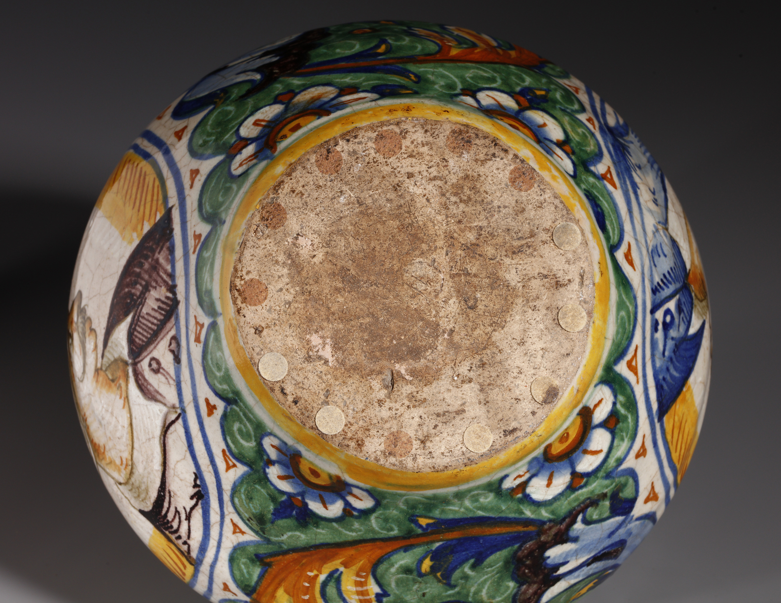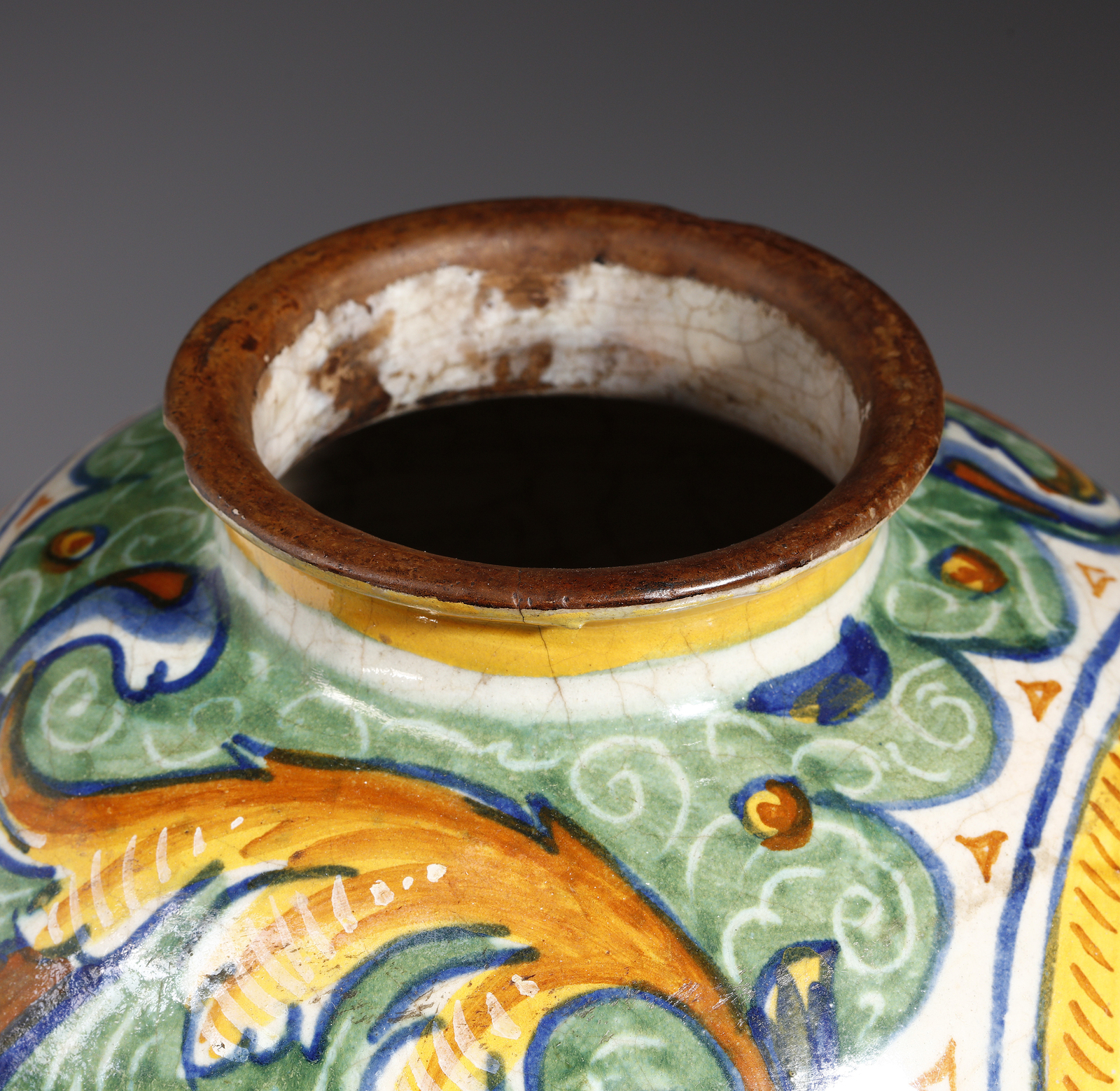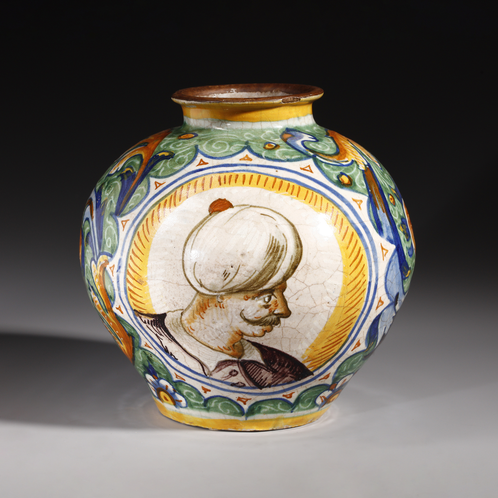 Vaso a boccia in maiolica policroma con figure di turco e uomo con cappello entro [..]
