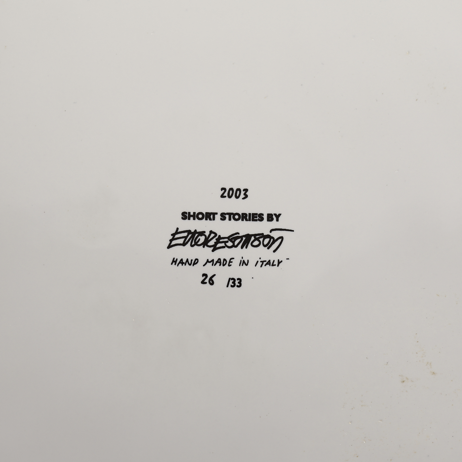 26/33. Alla base 2003 SHORT STORIES BY Ettore Sottsass HAND MADE IN ITALY. Edizione totale: 33 esemplari + 3 prove d'artista di 14 oggetti in ceramica e vetro. Pubblicazione: S. Campitelli, A. Blessi, E. Sottsass, Racconti. Quattordici ceramiche e vetri di Ettore Sottsass, Livorno 2003. Milco Carboni, Sottsass: 700 Disegni, Skira editore, Milano, 2005. Lievi difetti.