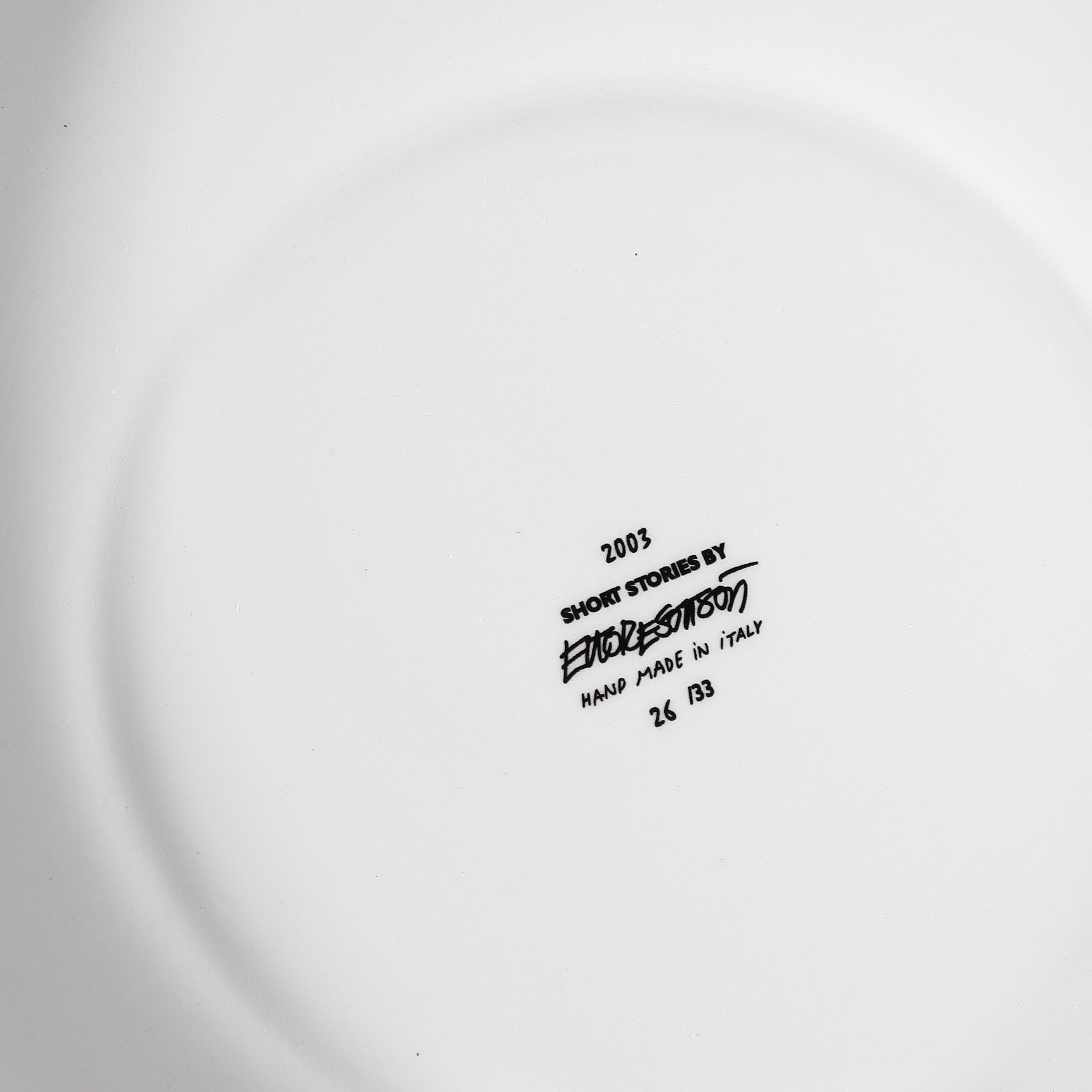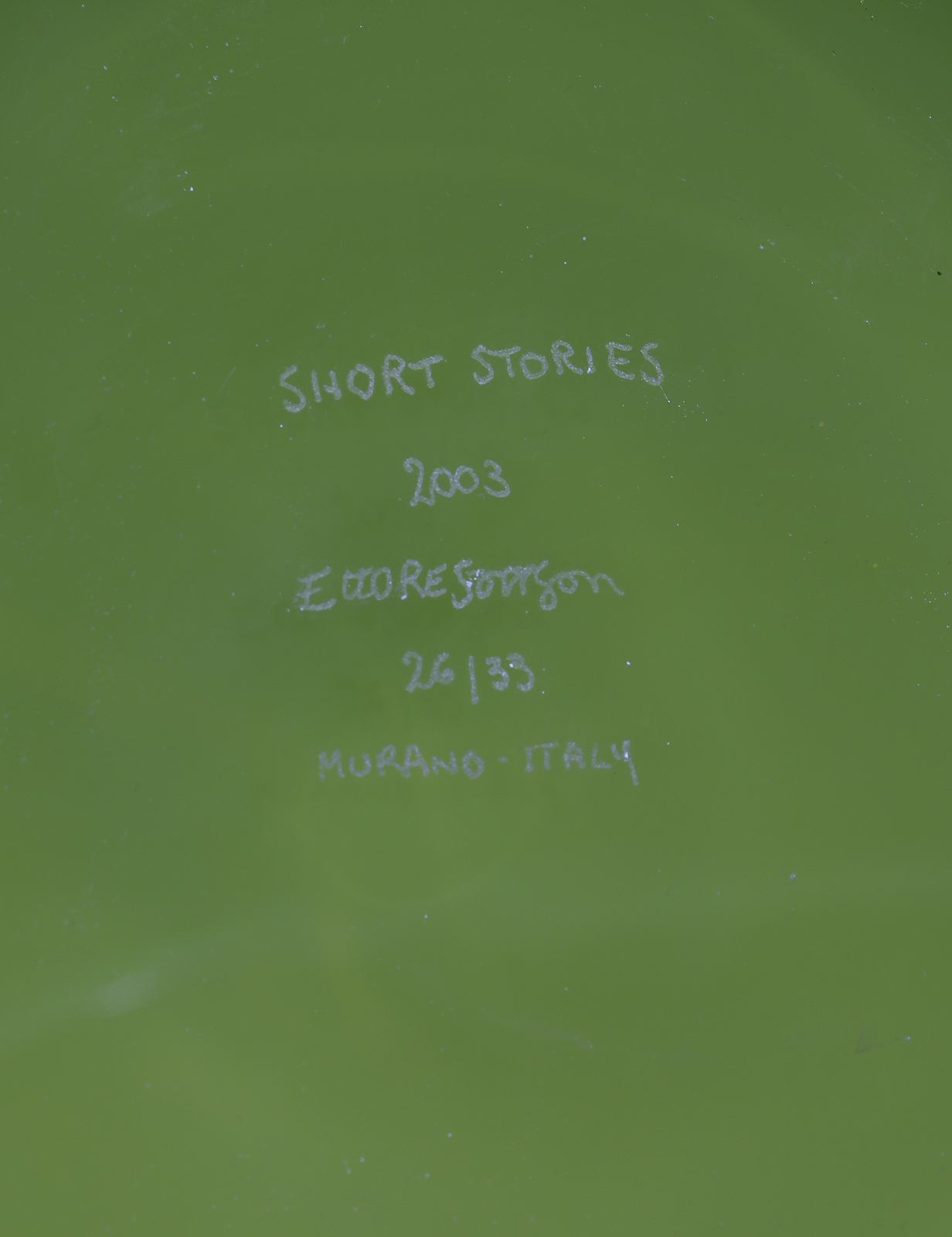 26/33. Alla base 2003 SHORT STORIES BY Ettore Sottsass HAND MADE IN ITALY. Edizione totale: 33 esemplari + 3 prove d'artista di 14 oggetti in ceramica e vetro. Pubblicazione: S. Campitelli, A. Blessi, E. Sottsass, Racconti. Quattordici ceramiche e vetri di Ettore Sottsass, Livorno 2003. Milco Carboni, Sottsass: 700 Disegni, Skira editore, Milano, 2005.