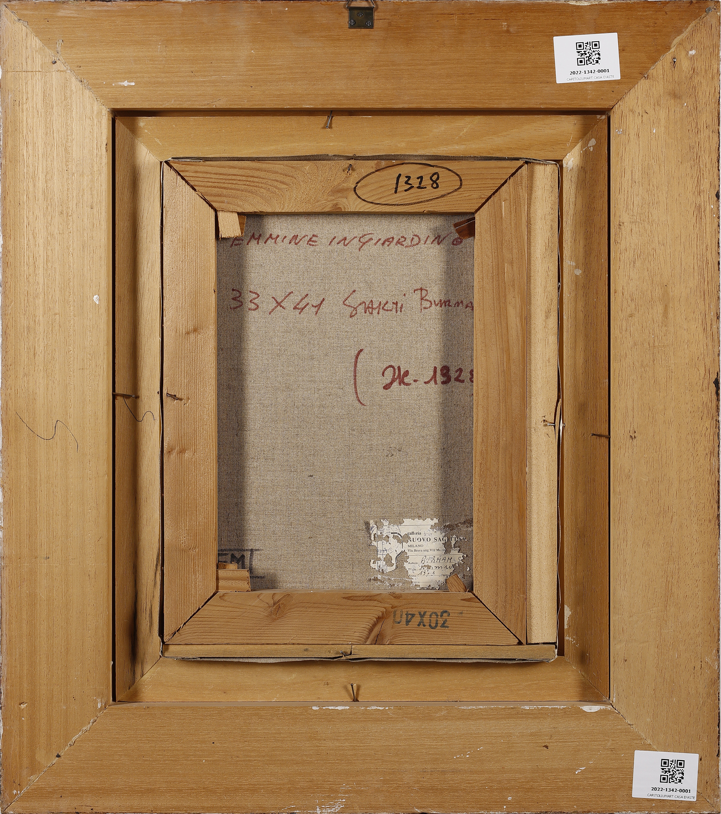 Firma in basso a sinistra. Al retro titolo, firma, anno e cartiglio descrittivo Galleria Nuovo Sagittario, Milano. Autentica dell'artista su fotografia con timbro Galleria Nuovo Sagittario, Milano. Provenienza: Galleria Nuovo Sagitario, Milano. Collezione privata. Lievi difetti.