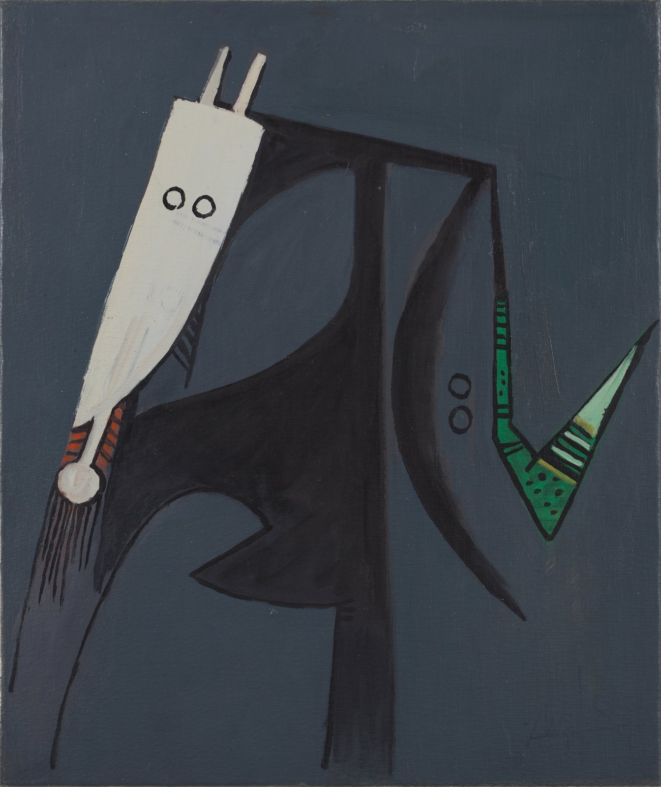 Firma in basso a destra. Al retro cartiglio descrittivo Galleria Nuovo Sagittario, Milano. Autentica dell'artista su fotografia con timbro Galleria Nuovo Sagittario, Milano. Provenienza: Galleria Nuovo Sagittario, Milano. Collezione privata, Rovigo. Pubblicazione: Wifredo Lam: Catalogue raisonné a cura di Eskil Lam (n. 67.07). W.Lam opere scelte a cura di Domenico Porzio, Galleria Nuovo Sagittario, Milano, tav.1. Si ringrazia Eskil Lam per aver confermato l'autenticità dell'opera.