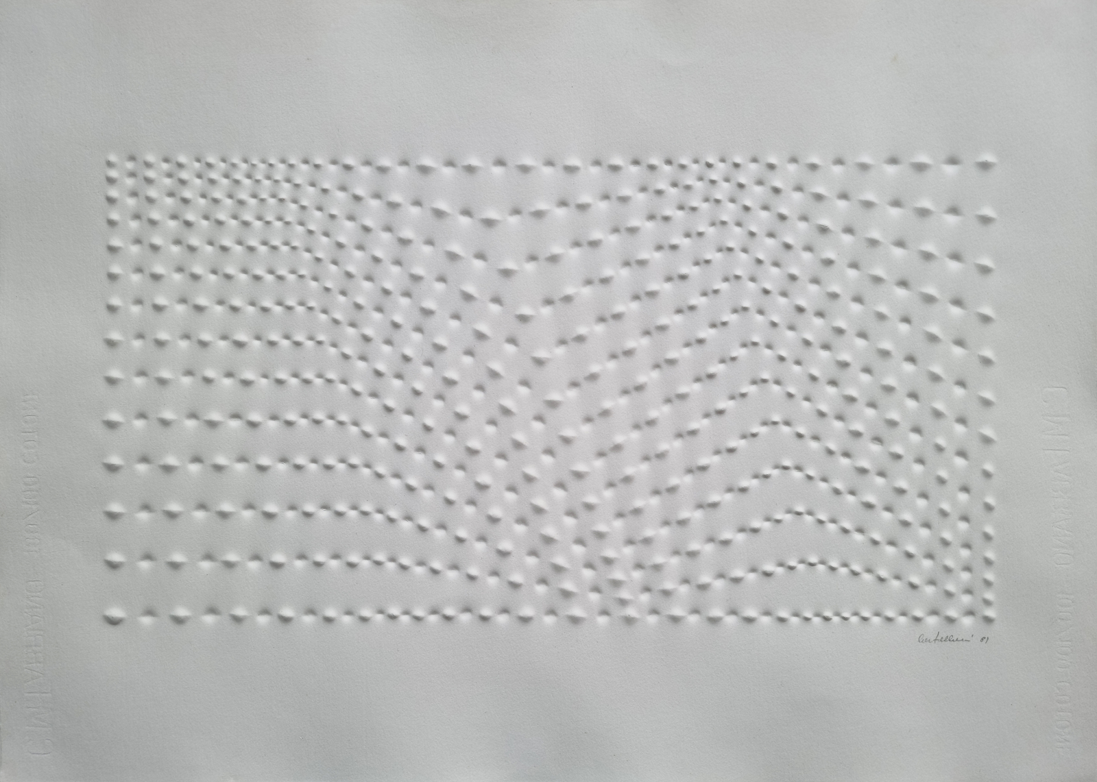 Firma e anno in basso a destra. Opera archiviata presso l'Archivio Enrico Castellani, Milano, come da documentazione fotografica allegata all'opera riportante il relativo numero d'inventario.