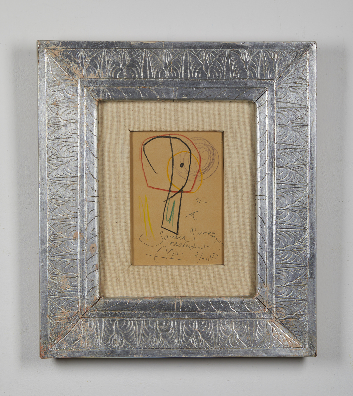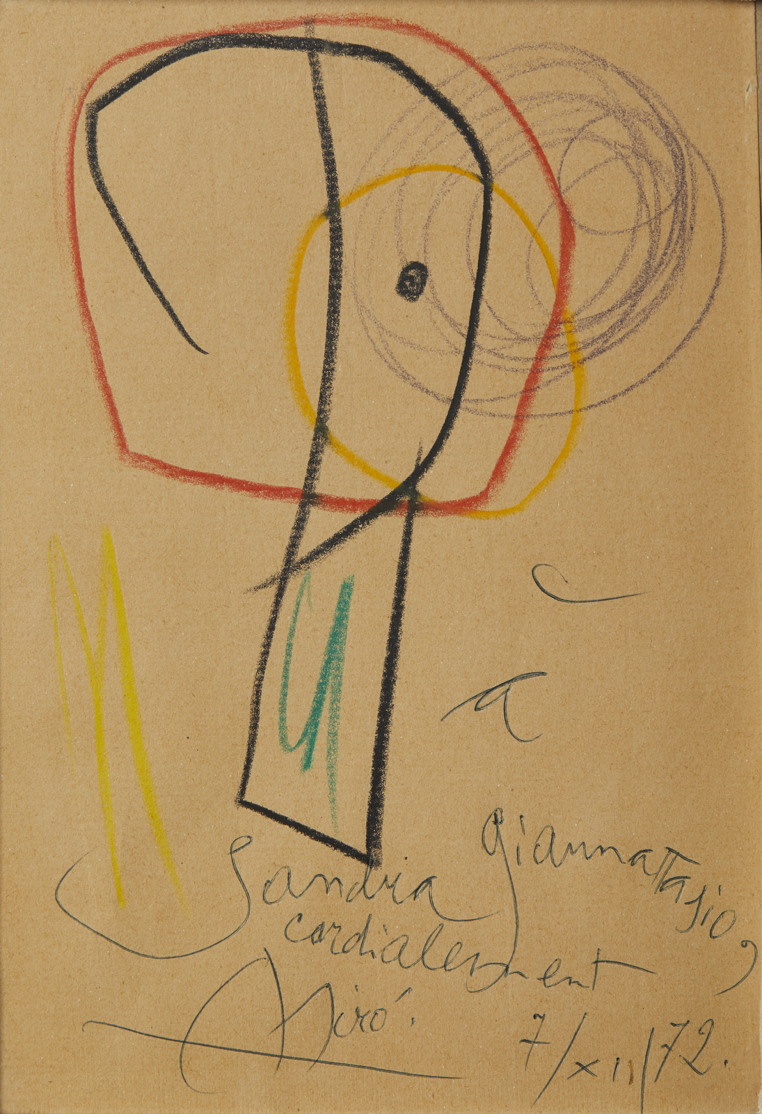 Dedica, firma e anno in basso a penna. Dichiarazione in fede della storica dell'arte Sandra Giannattasio, a cui l'opera è dedicata. Certificato di autenticità su fotografia rilasciato da Ariane Lelong-Mainaud per ADOM, Association pour la Défense de l'Oeuvre de Joan Mirò, rue de Miromesnil, Parigi. Lievi difetti.