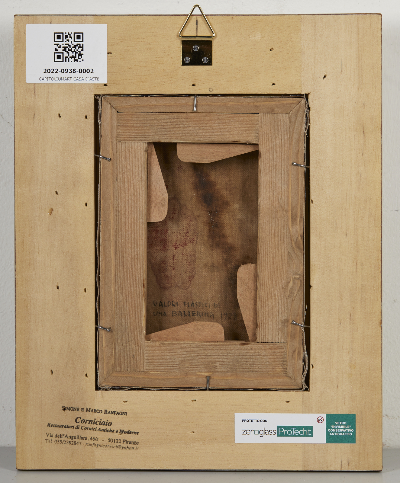 Firma in basso a sinistra. Expertise a cura di Paolo Baldacci, Milano. Provenienza: Galleria La Bussola, Torino. Collezione Boggio. Torino. Collezione privata.''Sul retro della tela figura una scritta in caratteri maiuscoli col titolo Valori plastici di una ballerina e la data 1928, della quale è tuttavia impossibile valutare l'autografia trattandosi di una scrittura non corsiva. L'autenticità del dipinto - un bozzetto di piccolissime dimensioni - si evince piuttosto dal confronto stilistico con alcuni soggetti analoghi risalenti allo stesso anno. Tra questi va considerato in particolare il dipinto Valori plastici di un nudo. La stilizzazione delle scomposizioni anatomiche del nudo è molto simile nei due dipinti, e in particolare nel curioso attacco tra il collo e i seni della figura femminile. Il dipinto proviene dalla Galleria La Bussola di Torino, dove fu acquistato dal pittore P. Boggio nel 1960 circa''