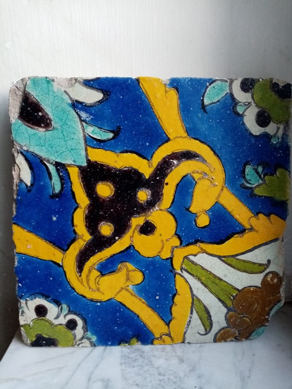 Mattonella in ceramica policroma, arte Safavide, India o Iran, sec. XVII/XVIII, cm 22.