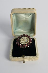 GIOVANNI e CLAUDIA MELLI Spilla in oro con granati, perline e calcedonio, sec. XIX, entro astuccio coevo. [..]