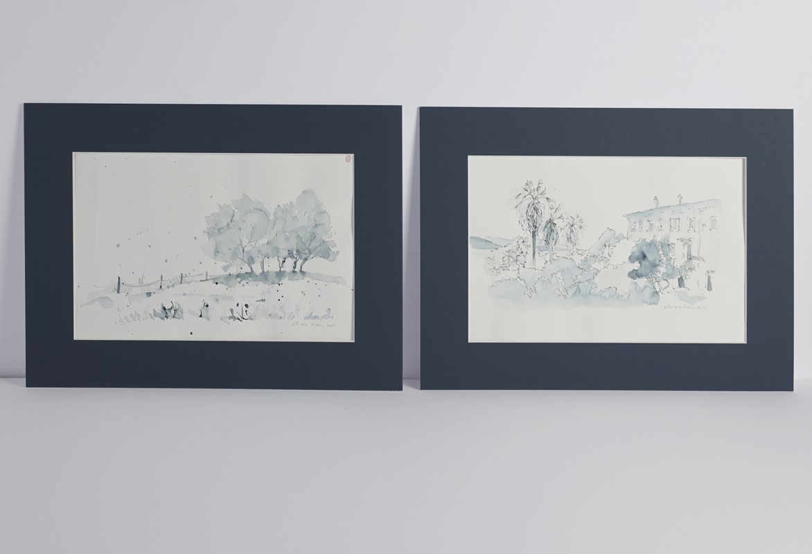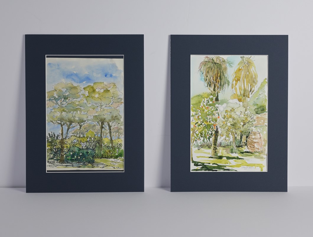 Group of 4 watercolors depicting landscapes, two of which in color with pines and palms and the other due monochrome with villa, palms and trees with fence, circa 30x21 cm, within blue passepartout, painted by the donor.