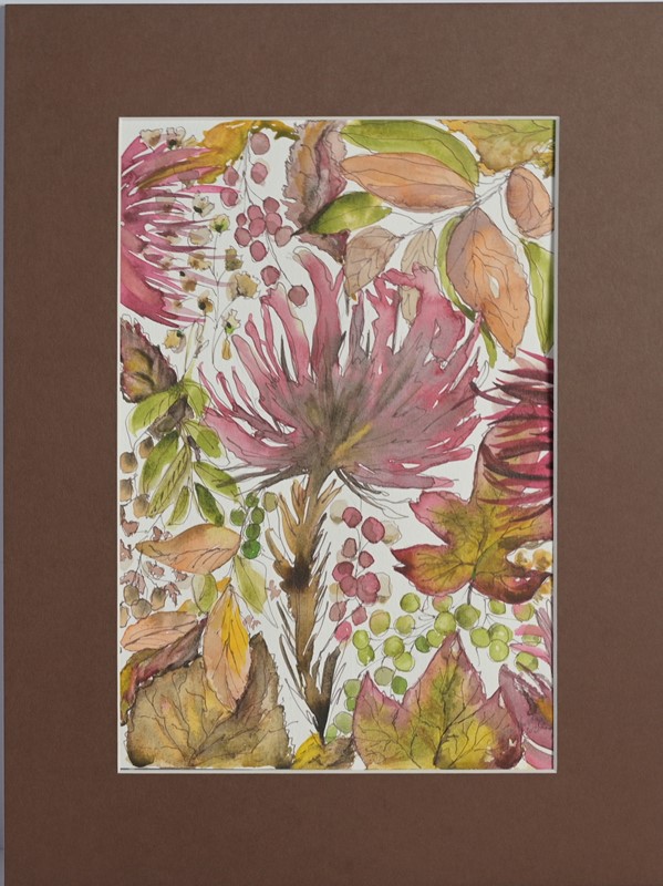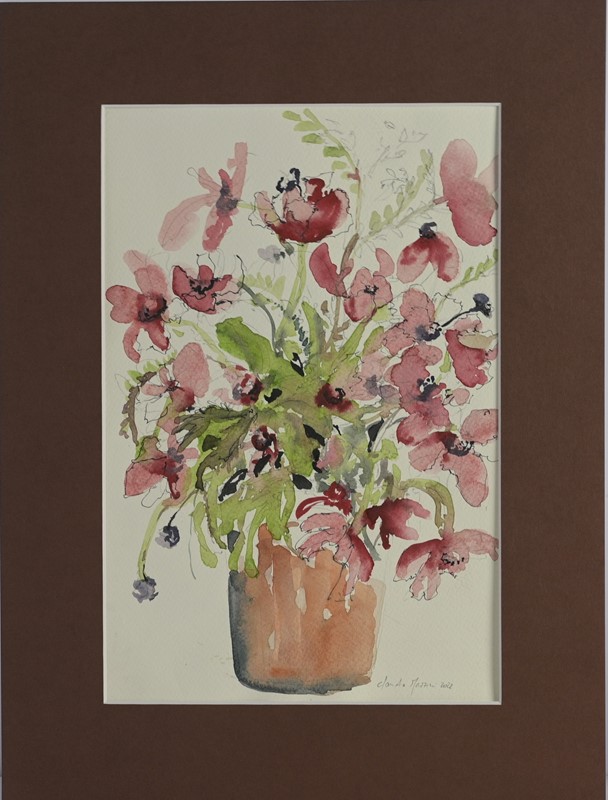 Group of 2 watercolors with poppies in vase and autumn leaves and berries (29.8x21 cm each), signed and dated '22, within purple-red passepartout, painted by the donor.