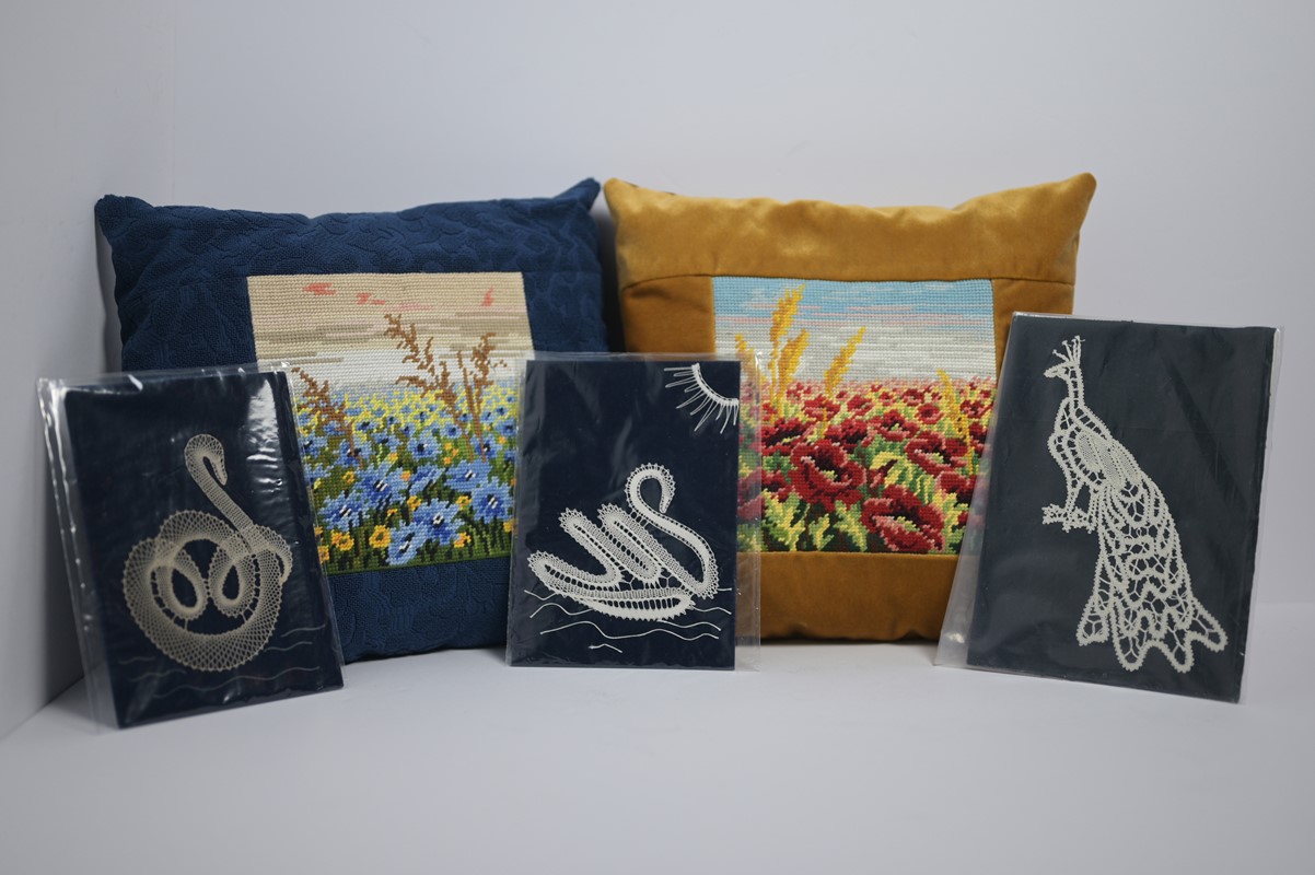 2 cuscini ricamati a mezzo punto raffiguranti fiori di cui uno su fondo blu e l'altro su fondo beige, cm 35x35 e 3 disegni ricamati a tombolo raffiguranti volatili, entro passepartout blu, opere delle Socie.