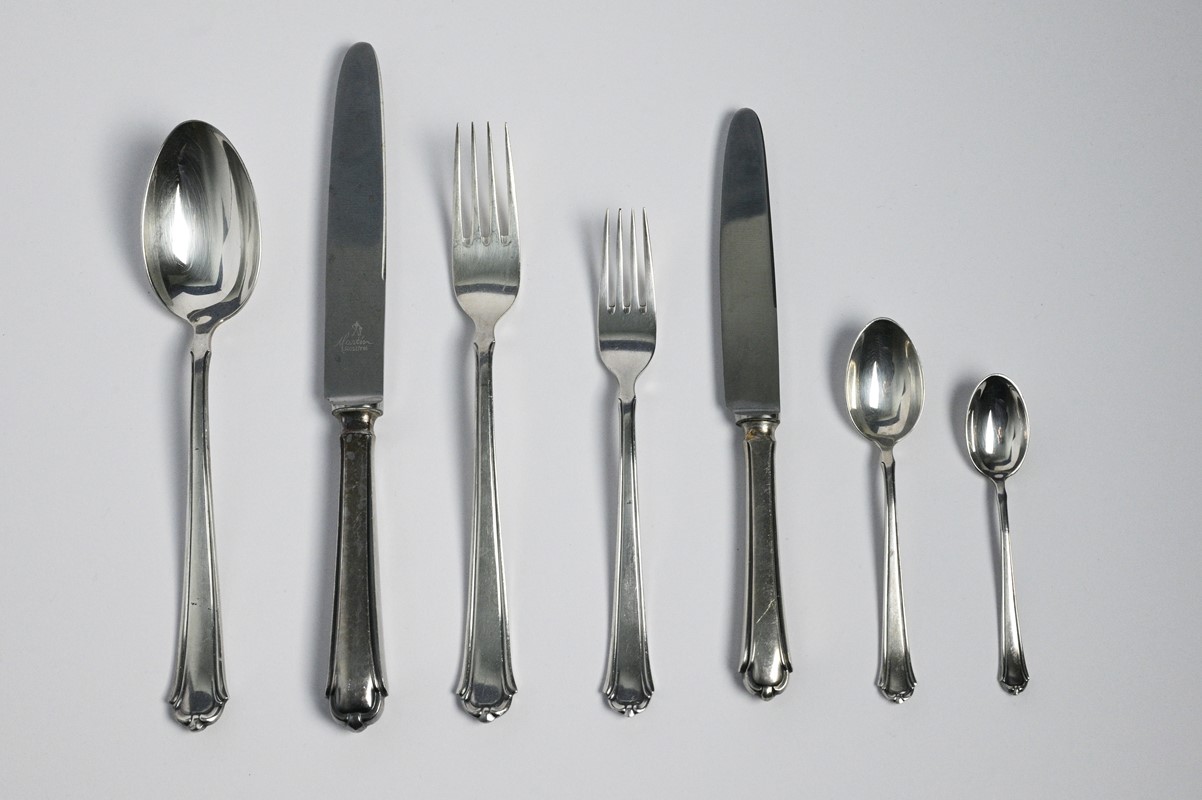 Servito di posate in metallo con presa sagomata composto da 12 coltelli, 11 forchette, 11 cucchiai, 12 coltelli frutta, 12 forchette da dessert, 9 cucchiaini da tè e 6 da caffè.