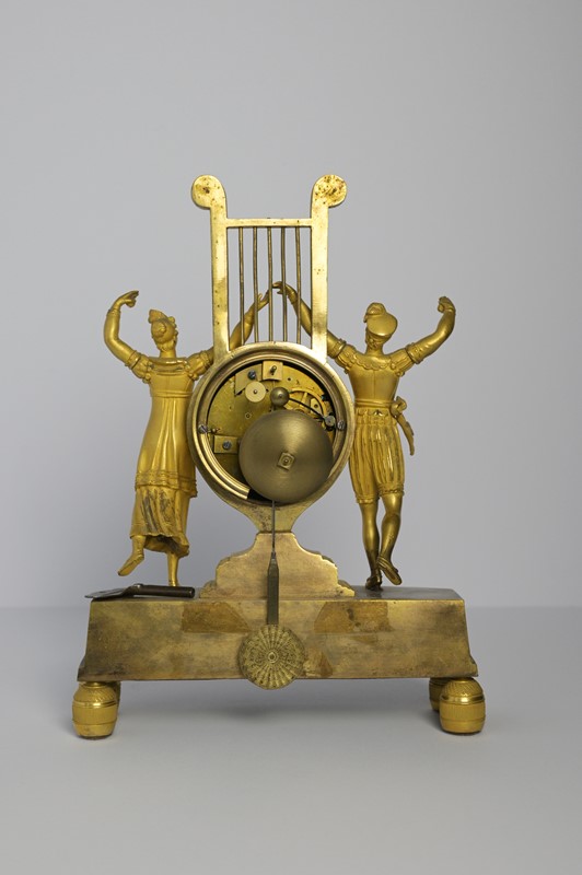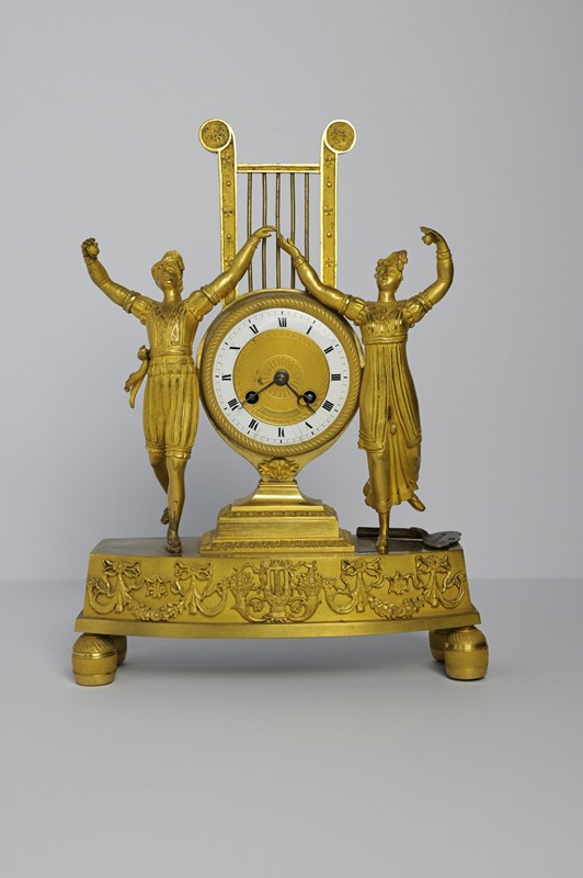 Table clock in gilded bronze modeled with two dancing figures in the clock face signed Le Roy à Paris, within a lyre motif, rounded platform base, France, early 19th century, h 30.5x22.5x7.5 cm.