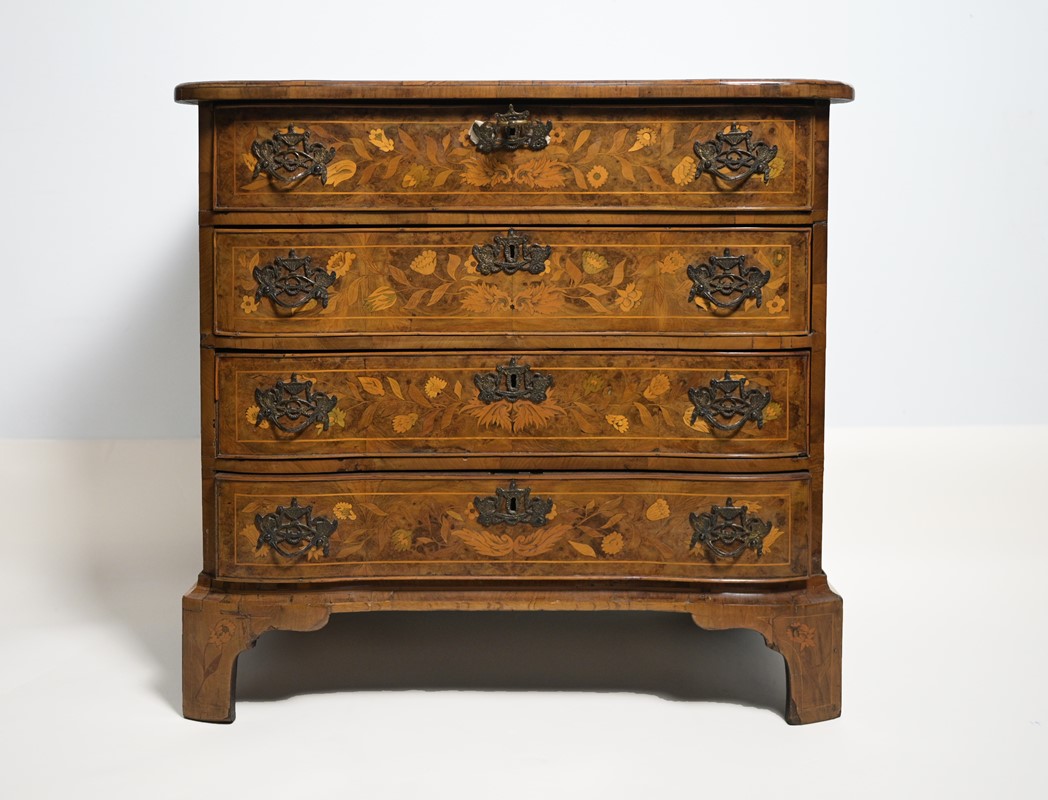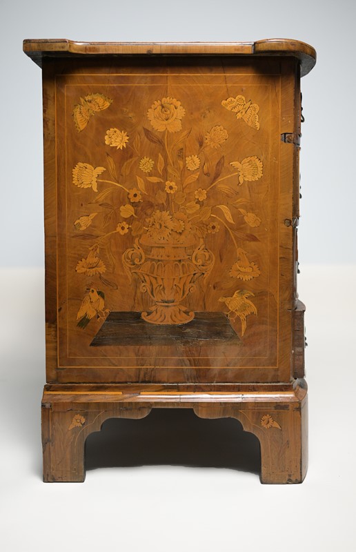 Piccolo cassettone a quattro cassetti con fronte bombato interamente intarsiato con fiori, vasi e figure alate e farfalle, fiancate con grandi vasi fioriti, Olanda, prima metà sec.XIX, cm 78x84x51.
