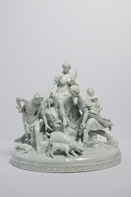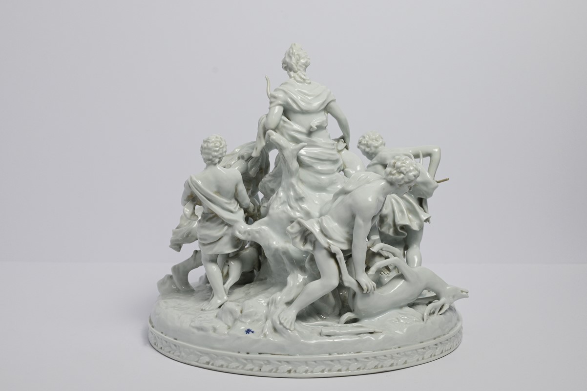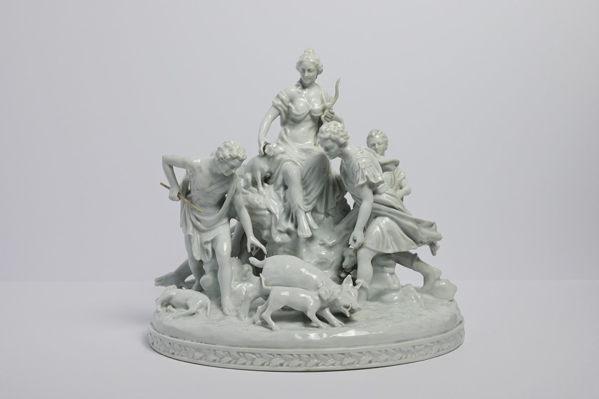 Grande gruppo in porcellana invetriata bianca raffigurante Diana cacciatrice con quattro figure virili a caccia, su base naturalistica con animali, probabilmente Francia, inizio sec.XX, h cm 35, restauri.