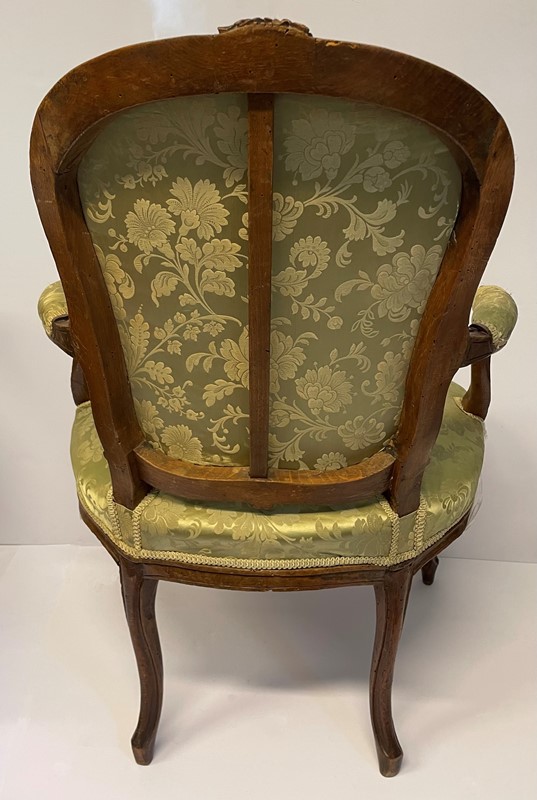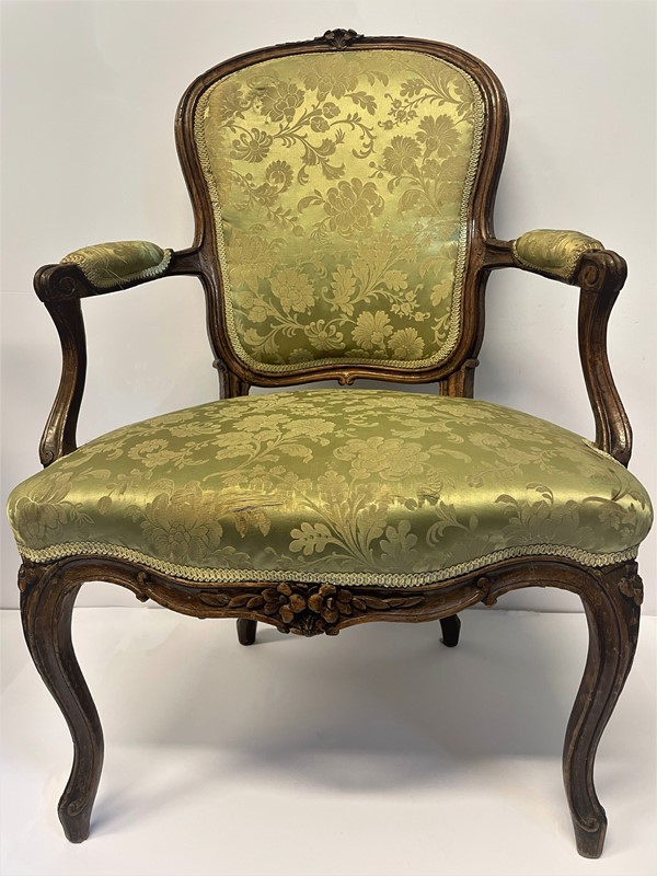 2 poltrone simili in stile metà sec.XVIII, intagliate con fiori e foglie, spalliere e sedili imbottiti, gambe mosse, rivestite in tessuto verde.