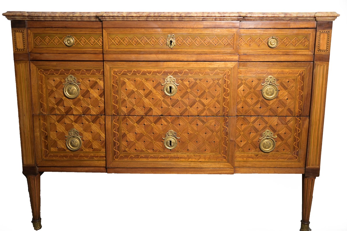 Cassettone a tre cassetti interamente impiallacciato a motivi geometrici, gambe coniche rastremate, piano in onice, probabilmente Francia, sec. XIX, cm 92x128x57.