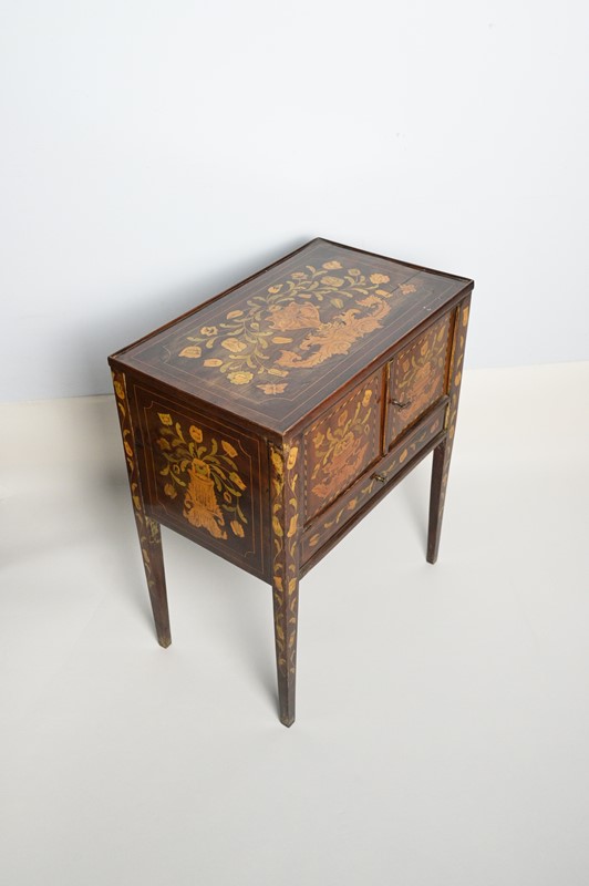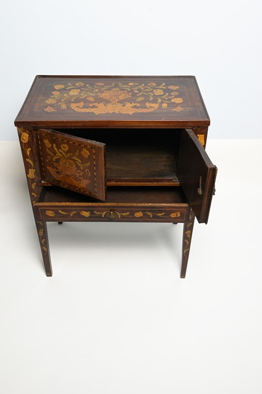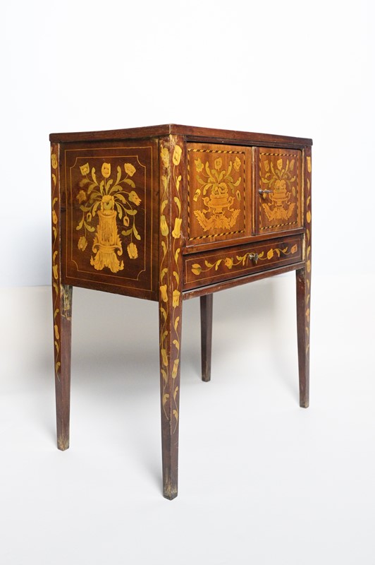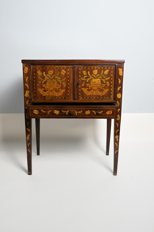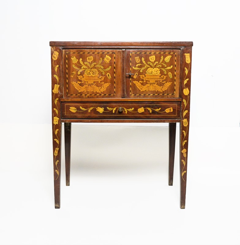 Piccolo Mobile da centro a due sportelli ed un cassetto in stile olandese del sec.XVIII, intarsiato con vasi di fiori, cm 64x53x32.