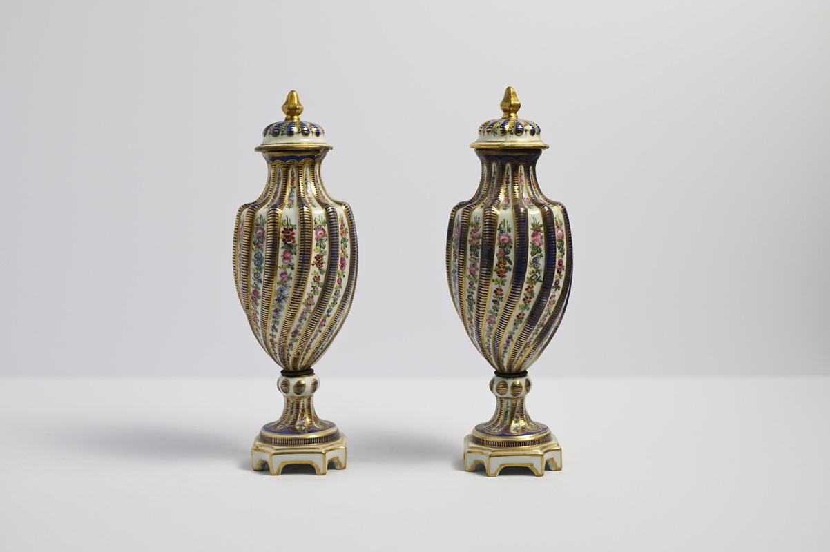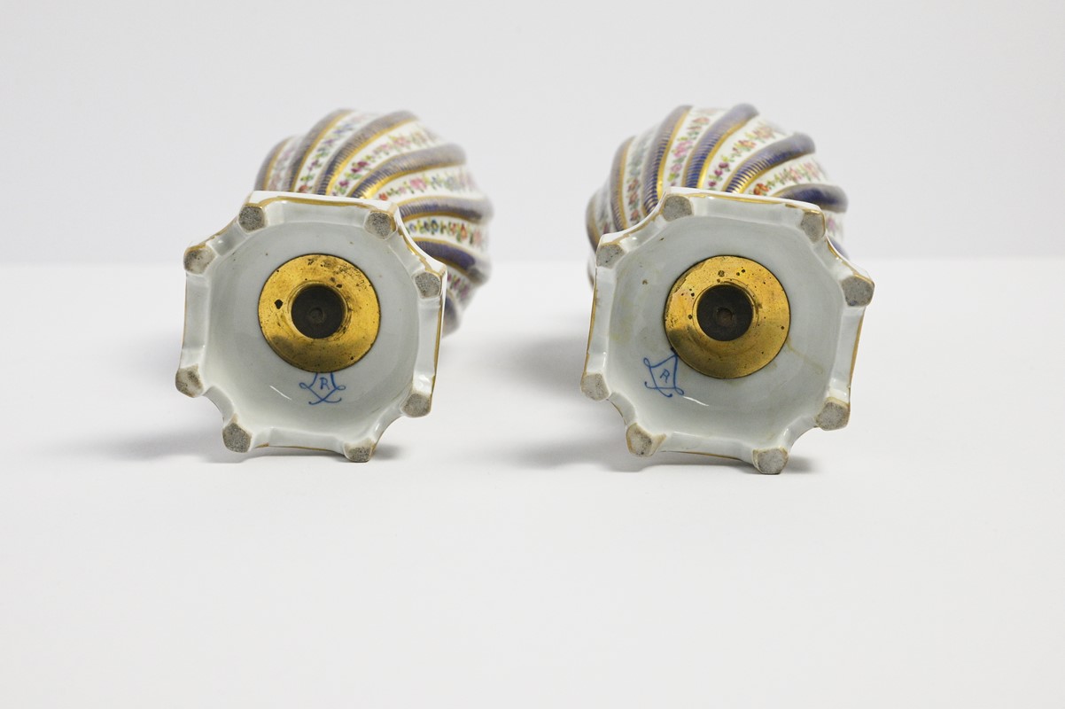 Pair of small vases with Sevres-style porcelain lids painted in helical blue bands and polychrome flowers, squared bases, early 18th century XX, h m 29, the lids have been restored.
