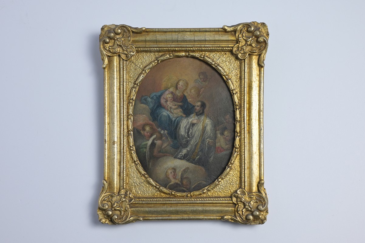 Painter of the beginning of the 18th century, Madonna and child with St. Luigi Gonzaga, oil on oval copper, 16x12 cm, wooden and gilded frame, 19th century.