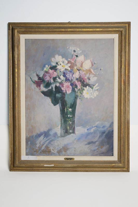 Luigi Mantovani (1880-1957) raffigurante mazzo di fiori in vaso, olio su tavola, cm 64x48, circa 1945, entro cornice in legno dorato.