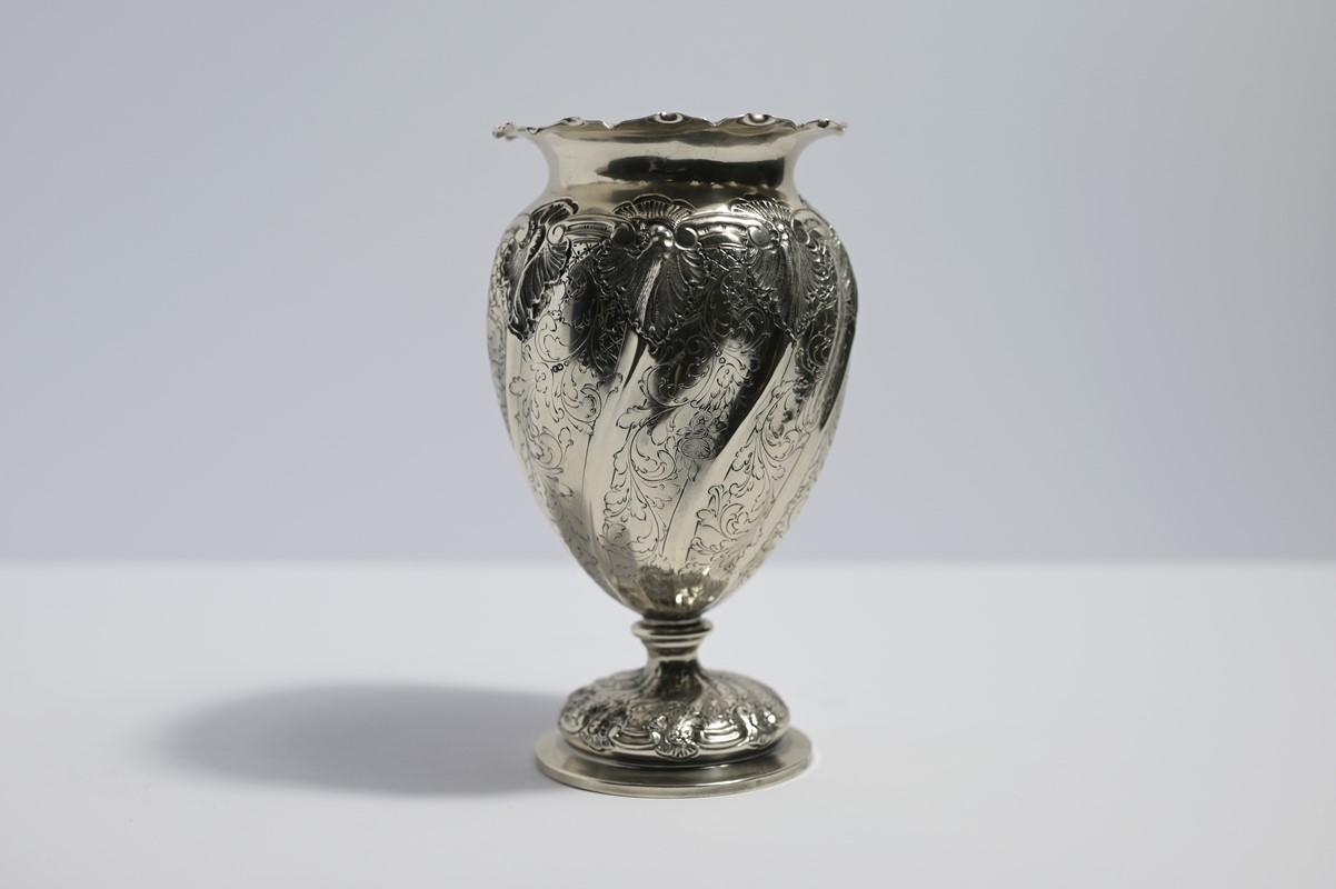 Vaso in argento con bordo ondulato interamente cesellato e inciso con fogliame e volute, h cm 23, gr 518.