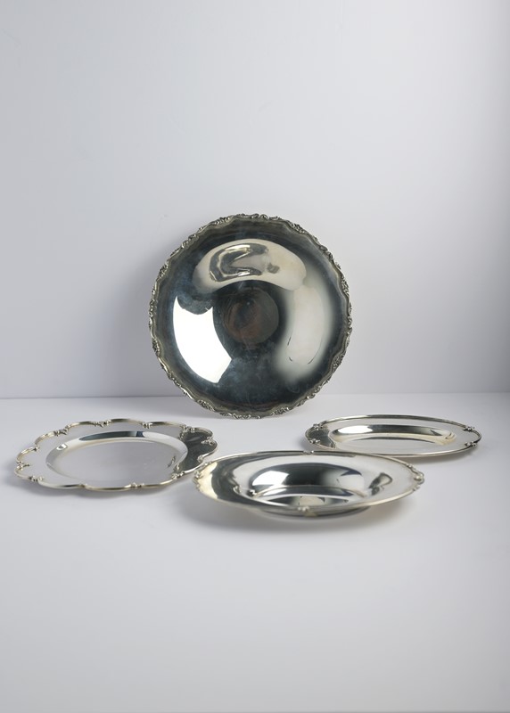 Gruppo di tre piccoli vassoi sagomati in argento bordati da volute, cm 22,5, gr 312; cm 22, gr 176 e cm 18, gr 151 e alzata circolare sagomata su tre piedini in argento, cm 5x24, gr 334.