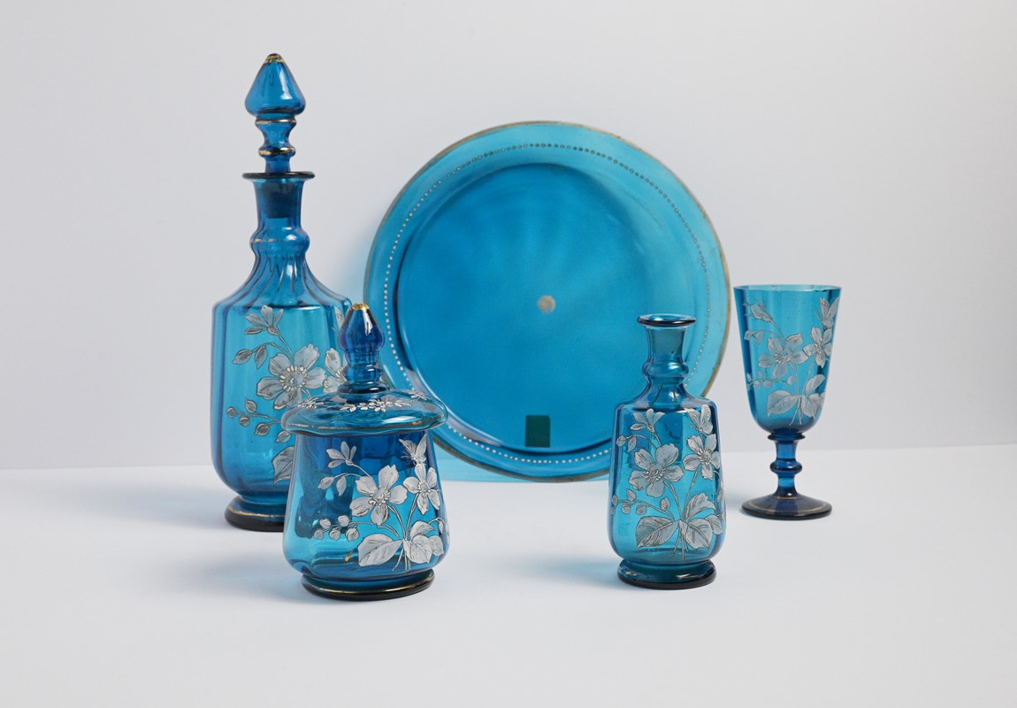 Servito in vetro blu dipinto in avorio con fiori, composto da bottiglia con tappo, bicchiere sbeccato, piccolo vaso, scatola con coperchio e vassoio circolare Ø cm 28, sec. XX.