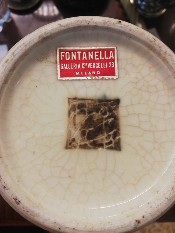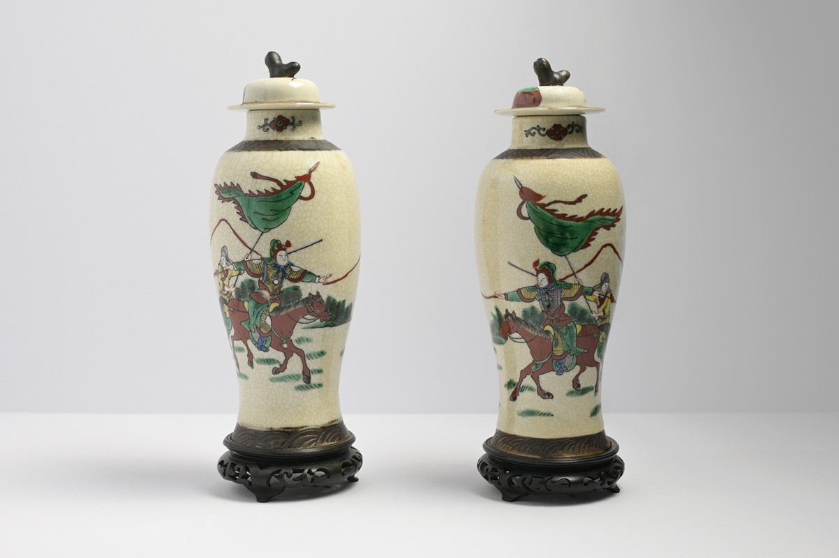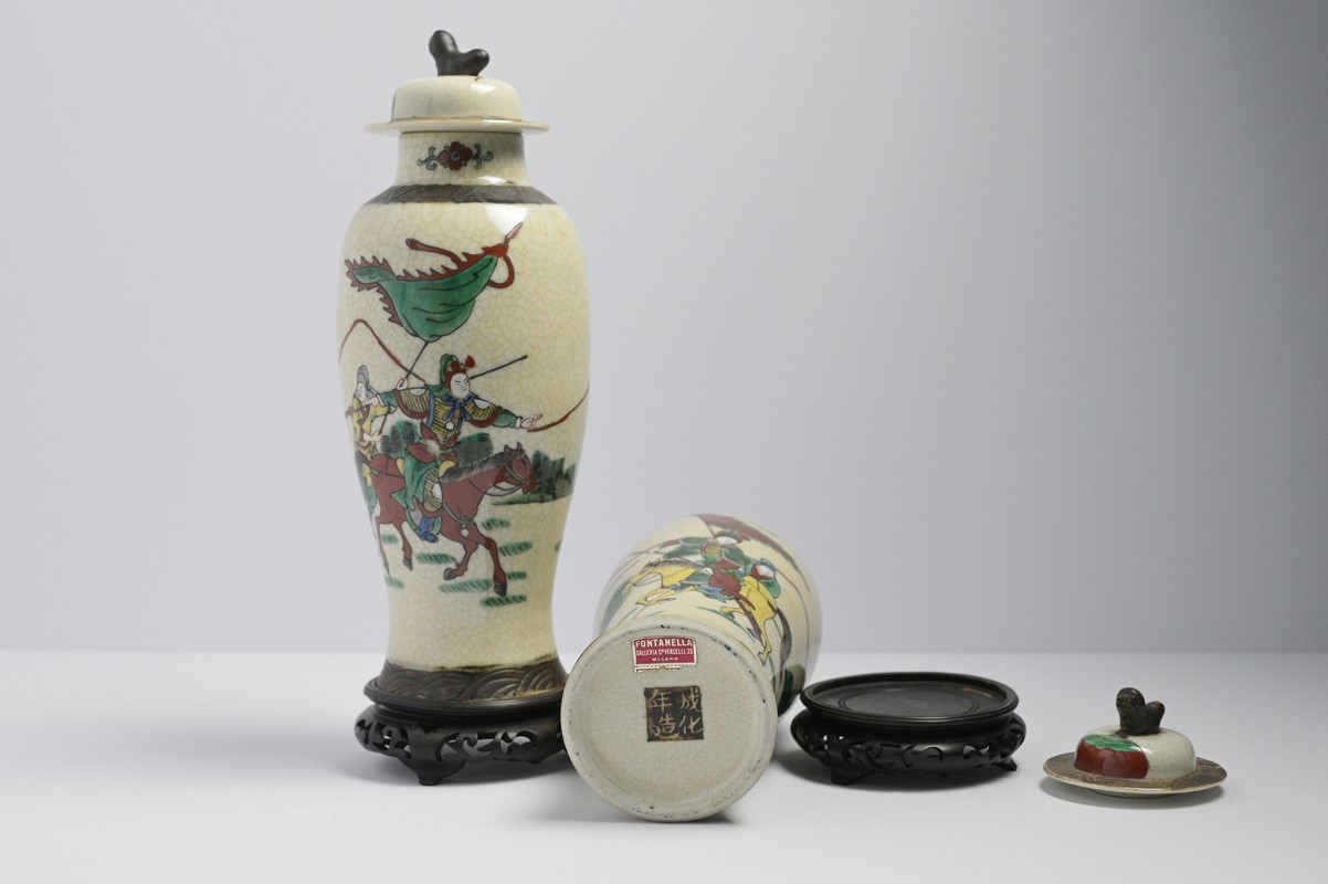 Coppia di piccoli potiche con coperchi in ceramica cinese a fondo crema dipinti in policromia con guerrieri a cavallo, prese in forma di leoni buddisti, fine sec.XIX/inizio sec.XX, h cm 27, completi di basi in legno traforato, recanti etichetta iscritta Fontanelle Galleria Corso Vercelli 23 Milano.
