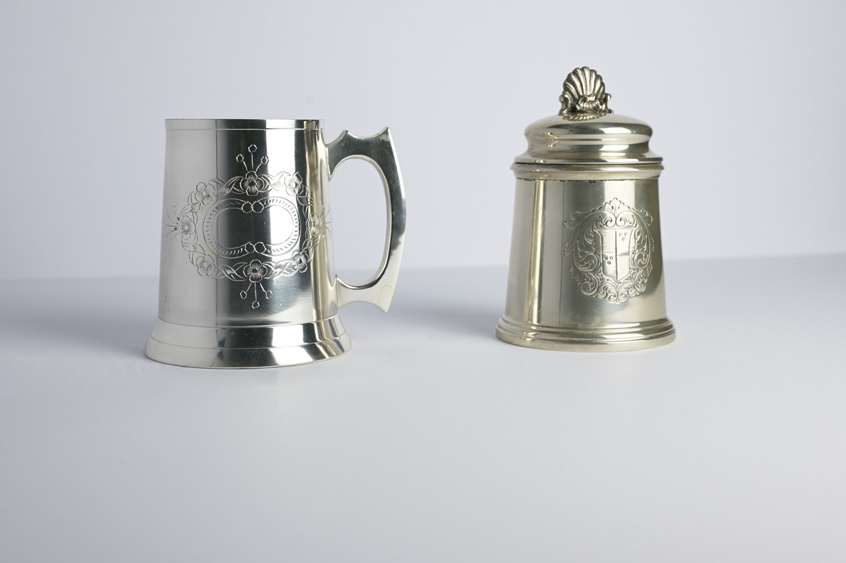 Truncated cone box in silver with lid surmounted by a shell socket engraved with coat of arms, h 16.5 cm and mug in silver-plated metal engraved with vegetable scrolls, h 12 cm.