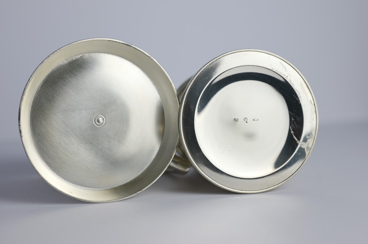 Scatola troncoconica in argento con coperchio sormontato da presa a conchiglia incisa con stemma, h cm 16,5 e boccale in metallo argentato inciso con cartigli vegetali, h cm 12, gr 316.