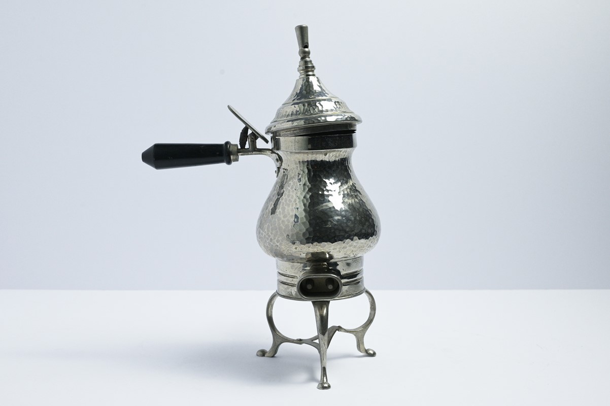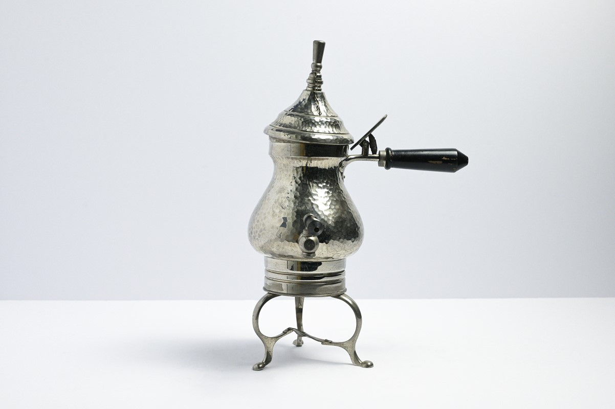 Pyriform metal samovar with domed lid, handle and tap in ebonized wood, tripod base with electrical outlet, 34.5 cm and circular tray for panettone in silver with large brim decorated with relief, advertising tray from the 1960s, produced by jewelers Cauldrons for the Motta panettone, Ø 32 cm.
