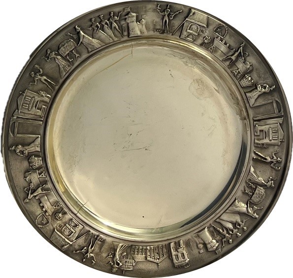 Samovar piriforme in metallo con coperchio a cupola, manico e rubinetto in legno ebanizzato, base tripode con presa elettrica, cm 34,5 e vassoio circolare per panettone, in argento con larga tesa decorato con rilievo, vassoio pubblicitario degli anni '60, prodotto dai gioiellieri Calderoni per il panettone Motta, Ø cm 32, gr 464.