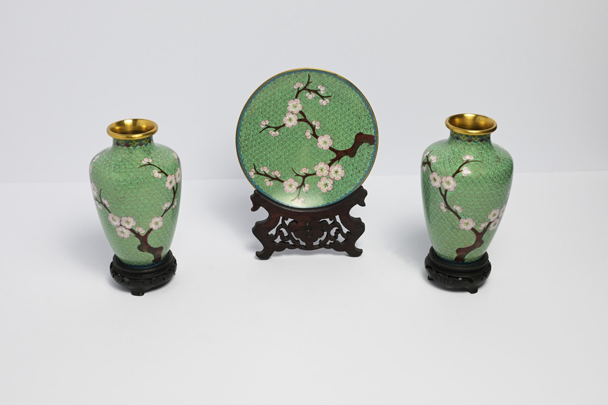 Coppia di vasi con piattino in smalto cloisonné a fondo color pistacchio con rami di pruno fiorito, Cina, inizio sec. XX, h cm 17, Ø cm 16,5, completi di basi in legno.