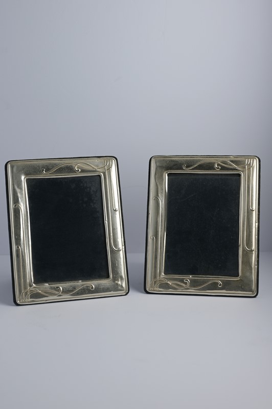 Pair of rectangular photo frames with embossed silver bands and liberty motifs, mounted in dark velvet, 24x19 cm, slight damages.