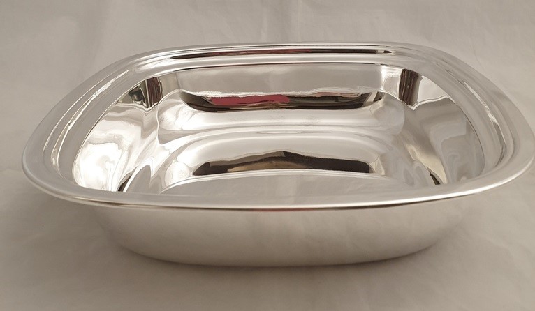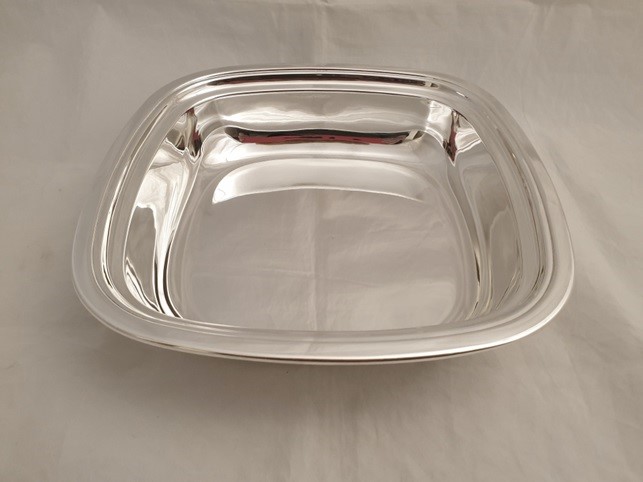 Vasca quadrata in argento con angoli arrotondati e cornice piatta, cm 6x27x27, gr 644.