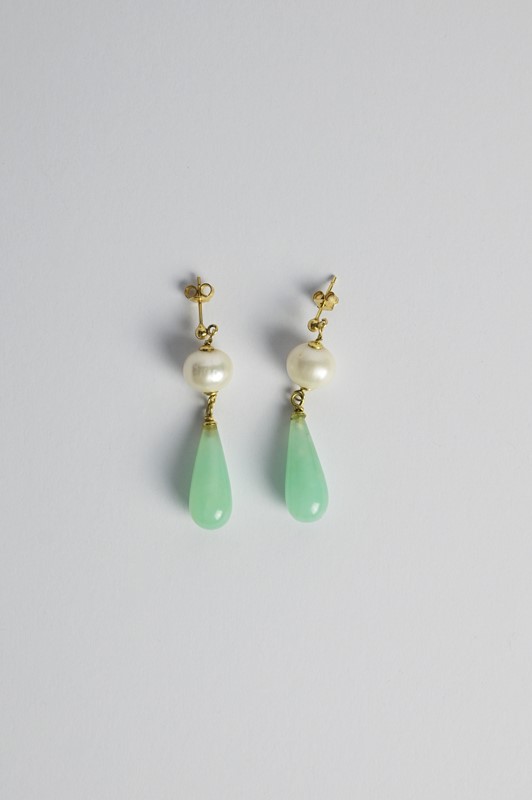 Orecchini in oro giallo con perle e pietre dure a goccia.