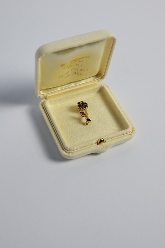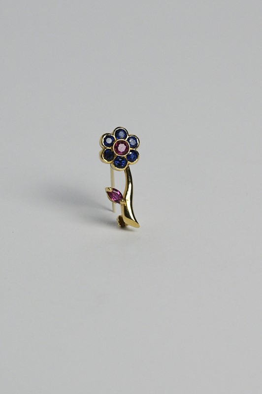 Piccola spilla in oro giallo con zaffiri e rubini, gr 4.