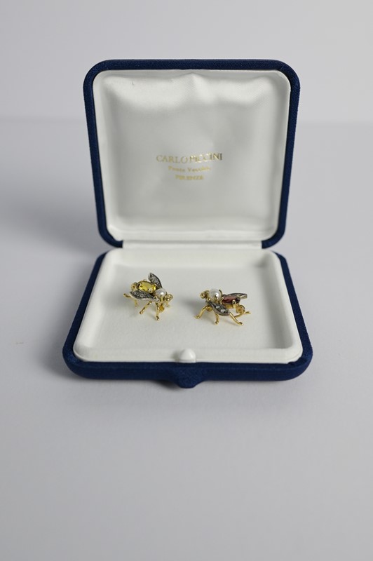 2 Brooche shaped as flies gold 18 kt and silver, 2 blue topazes, 2 pearls and diamonds.