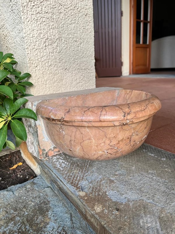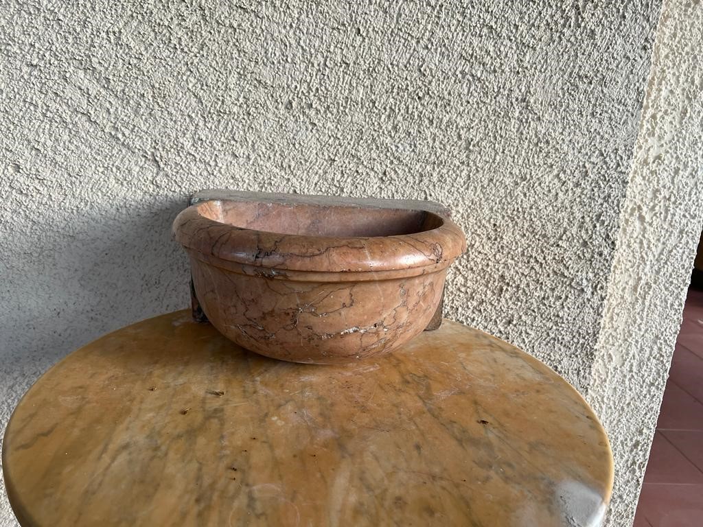 Grande acquasantiera in marmo rosa, larg. cm 36,5, prof. cm 36, h cm 18.