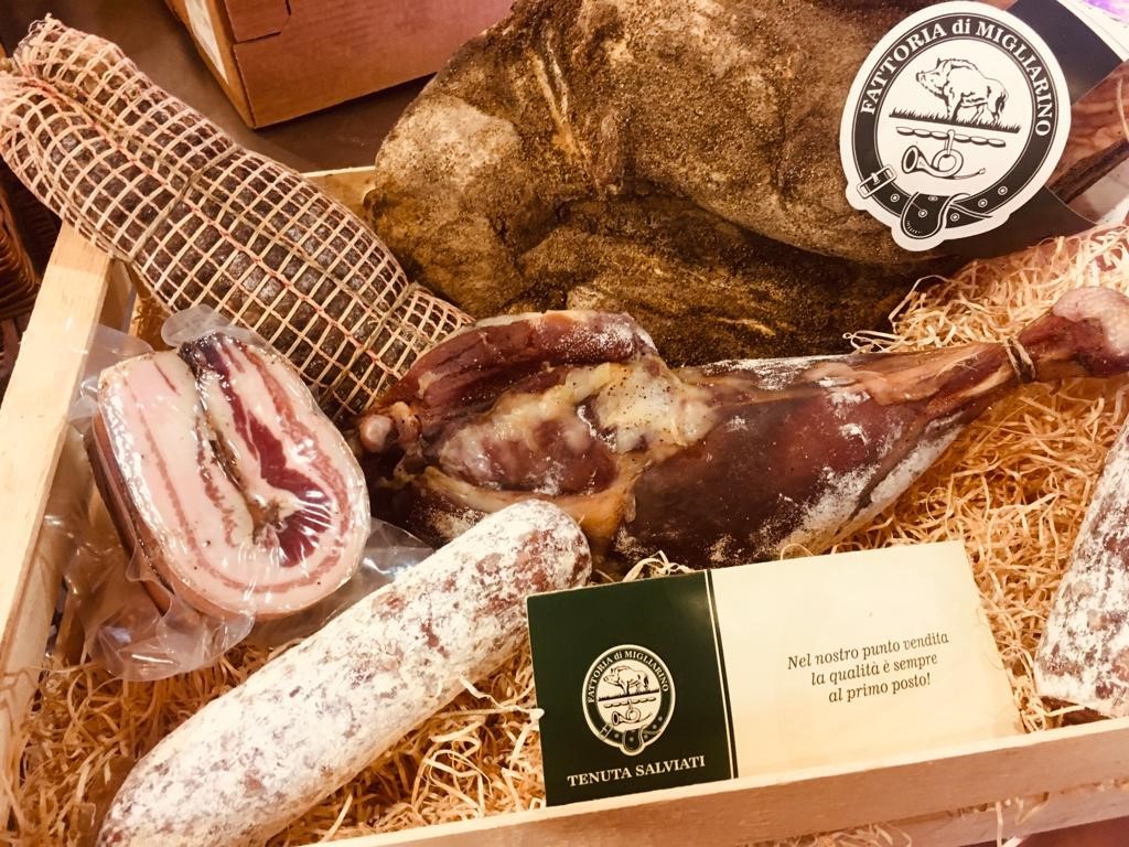 Prodotti della Fattoria di Migliarino (Pisa): prosciutto di maiale intero, trancio di prosciutto, prosciutto di tacchino disossato, prosciutto di tacchino a violino, salame di maiale, salame di cinghiale, mezzina , bresaola di tacchino, pancetta arrotolata, bocconcini di maiale, salamella dolce e salamella piccante, salsicce di maiale fresche, pepine fresche.