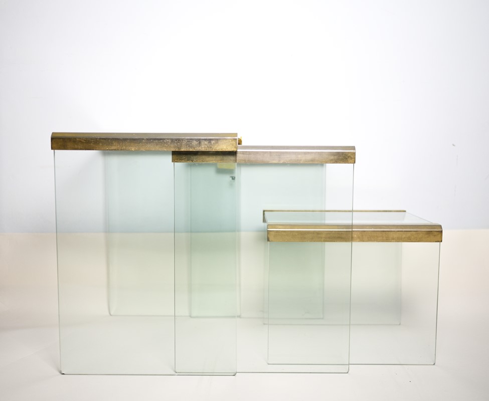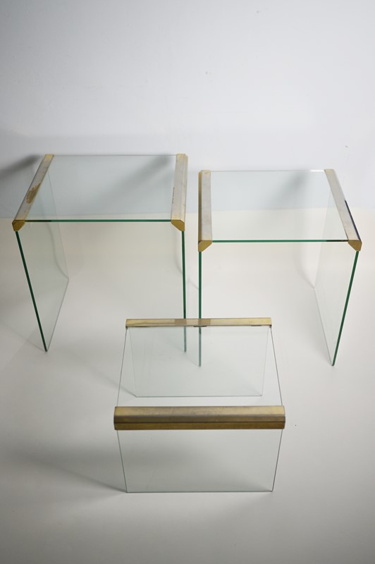 Serie di tre tavolini a nido realizzati in cristallo incolore con dettagli in metallo ottonato. Recano etichetta originale su uno dei tre, Gallotti e Radice Made in Italy, Italia 1970, h da cm 54 a 33 e lungh. da cm 50 a 35 e prof. cm 40.