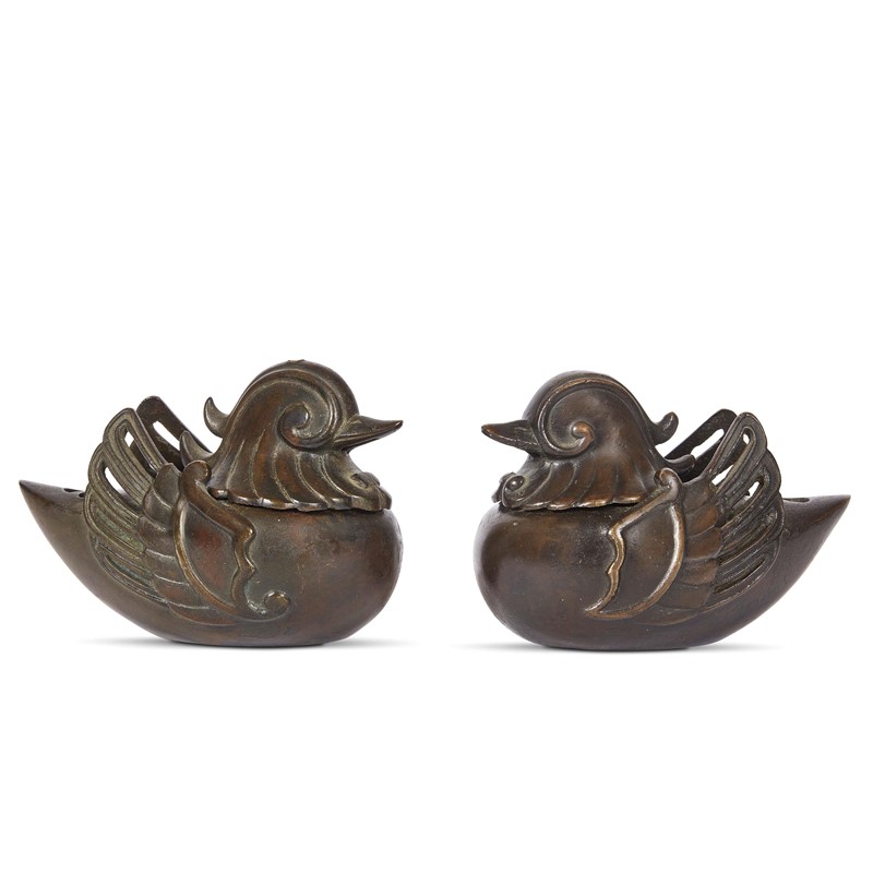 COPPIA DI CONTENITORI, CINA, DINASTIA QING, SEC. XVIII in bronzo a forma d'anatra mandarina, articoli di cancelleria antica cinese. Alt.cm 6,5 清 十八世纪 铜鸳鸯水盂一对